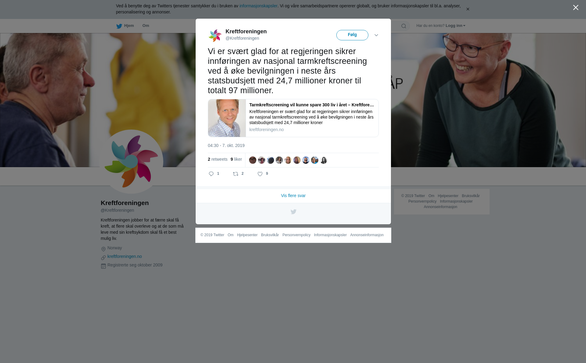 RT @Kreftforeningen: Vi er svært glad for at regjeringen sikrer innføringen av nasjonal tarmkreftscreening ved å øke bevilgningen i neste års statsbudsjett med 24,7 millioner kroner til totalt 97 millioner. https://t.co/qRJNtQnuRb