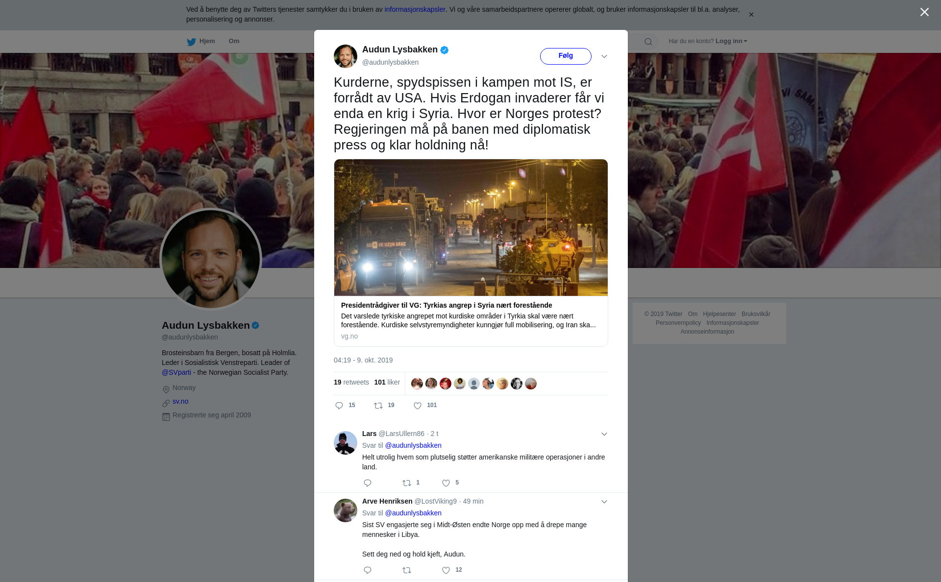 RT @audunlysbakken: Kurderne, spydspissen i kampen mot IS, er forrådt av USA. Hvis Erdogan invaderer får vi enda en krig i Syria. Hvor er Norges protest? Regjeringen må på banen med diplomatisk press og klar holdning nå! https://t.co/ZQfC9IwZ4l