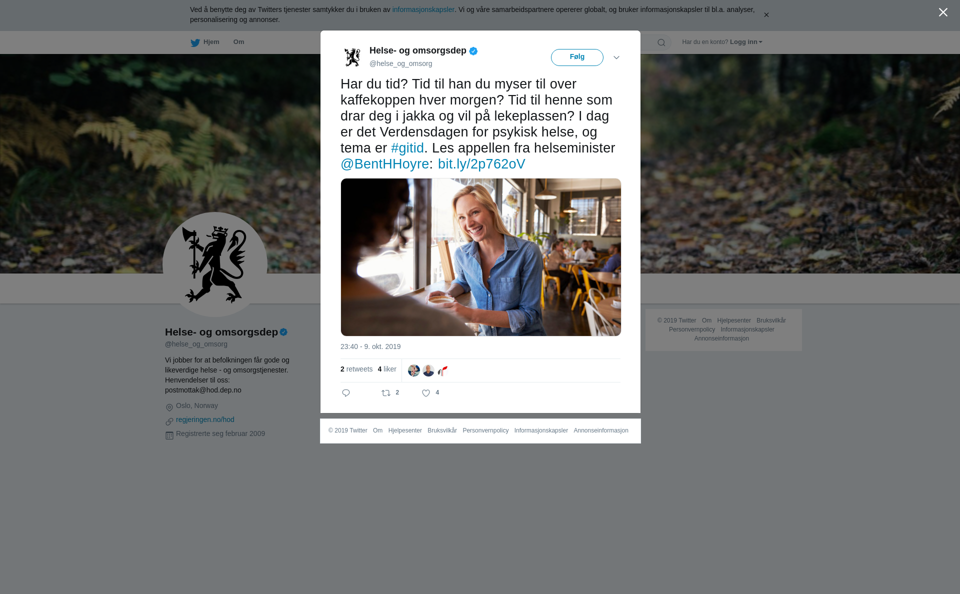 Har du tid? Tid til han du myser til over kaffekoppen hver morgen? Tid til henne som drar deg i jakka og vil på lekeplassen? I dag er det Verdensdagen for psykisk helse, og tema er #gitid. Les appellen fra helseminister @BentHHoyre: https://t.co/lTr0nuuM0F https://t.co/ZHbzydCNgh