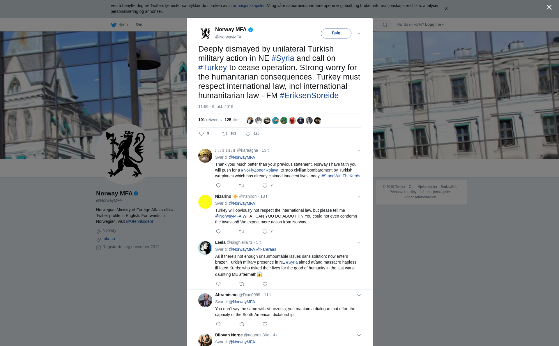 Deeply dismayed by unilateral Turkish military action in NE #Syria and call on #Turkey to cease operation. Strong worry for the humanitarian consequences. Turkey must respect international law, incl international humanitarian law - FM #EriksenSoreide