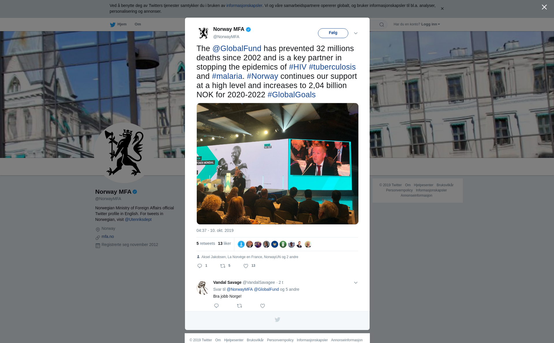 The @GlobalFund has prevented 32 millions deaths since 2002 and is a key partner in stopping the epidemics of #HIV #tuberculosis and #malaria. #Norway continues our support at a high level and increases to 2,04 billion NOK for 2020-2022 #GlobalGoals https://t.co/mZQZRnCPGx