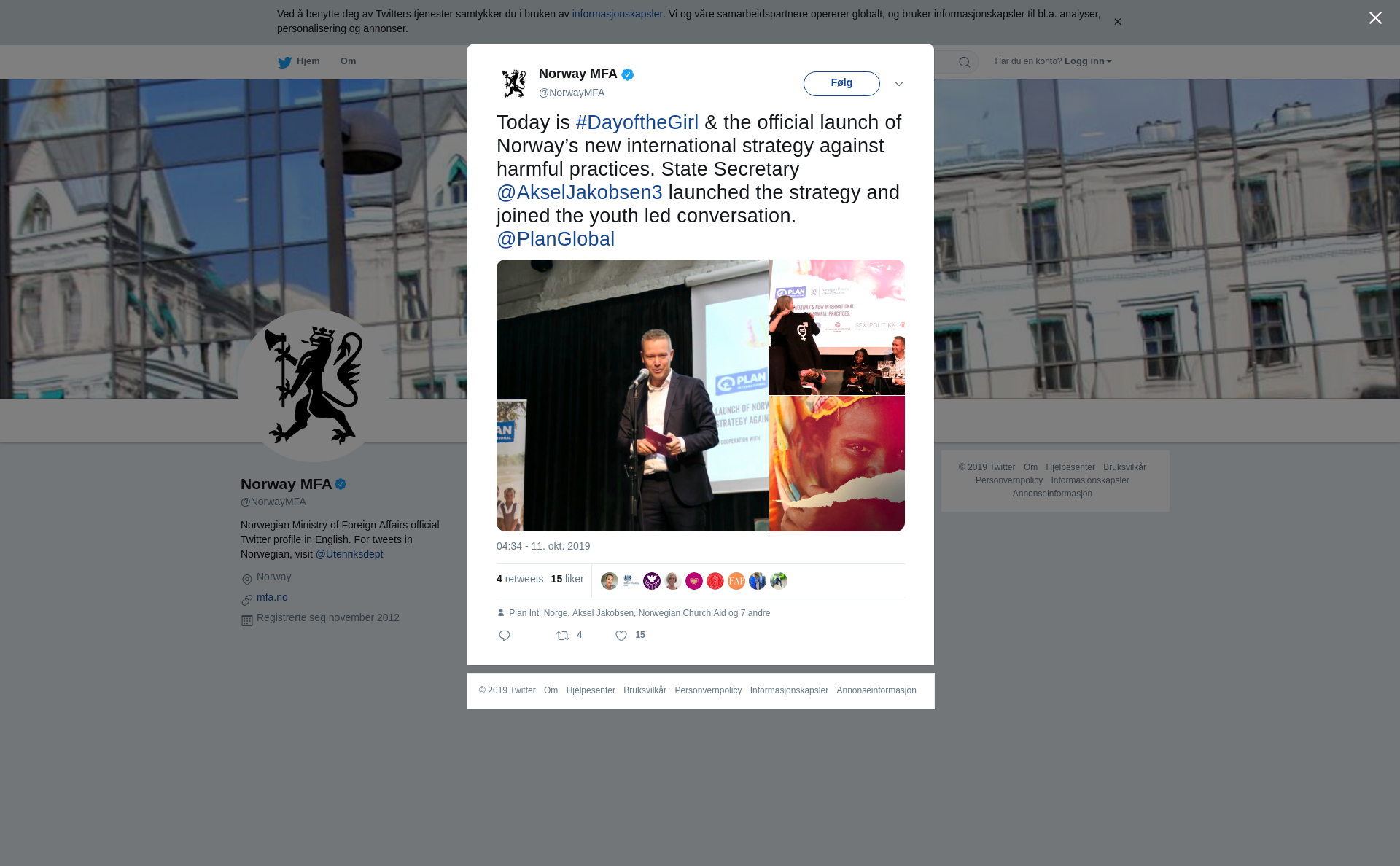 Today is #DayoftheGirl & the official launch of Norway’s new international strategy against harmful practices. State Secretary @AkselJakobsen3 launched the strategy and joined the youth led conversation. @PlanGlobal https://t.co/GJ2p3vE0NZ