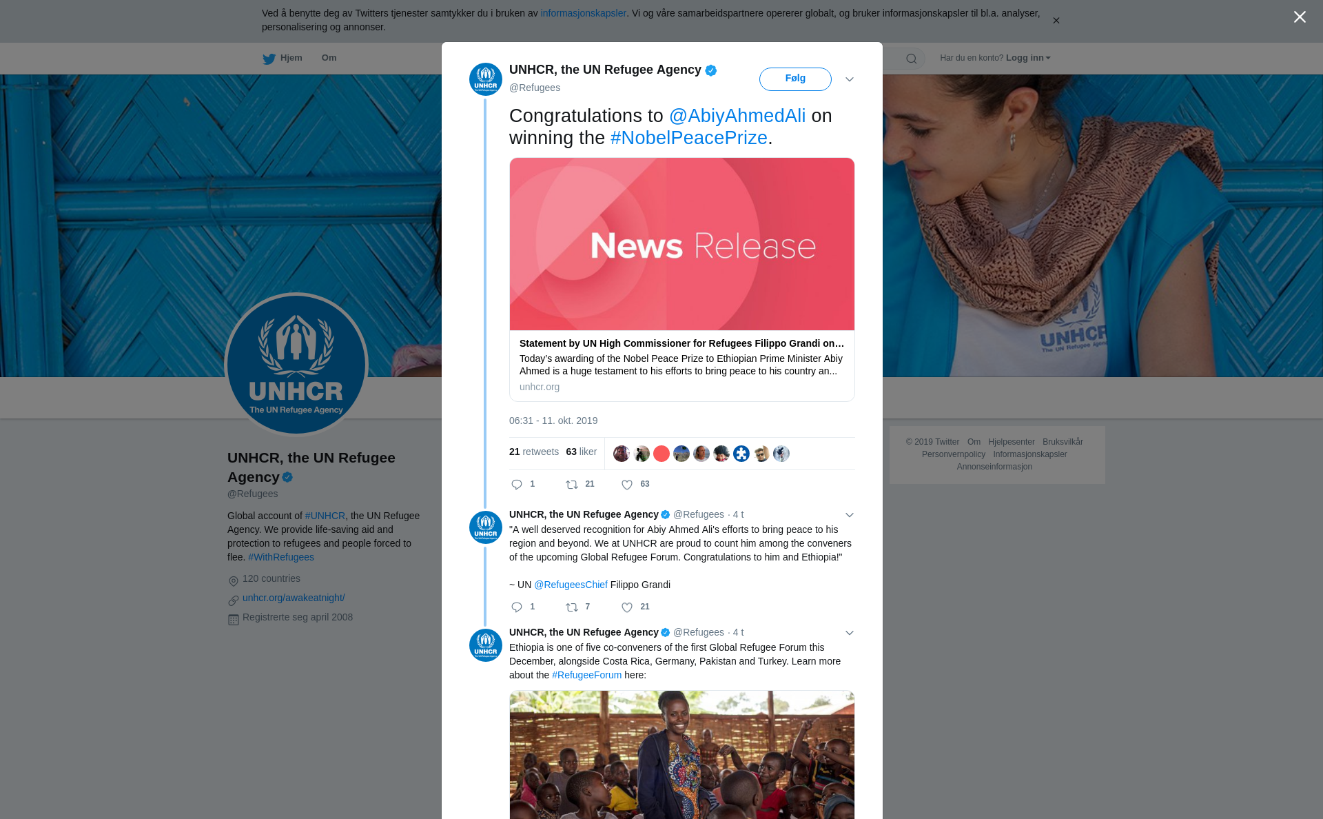 Statement by UN High Commissioner for Refugees Filippo Grandi on awarding of Nobel Peace Prize to Ethiopian Prime Minister Abiy Ahmed