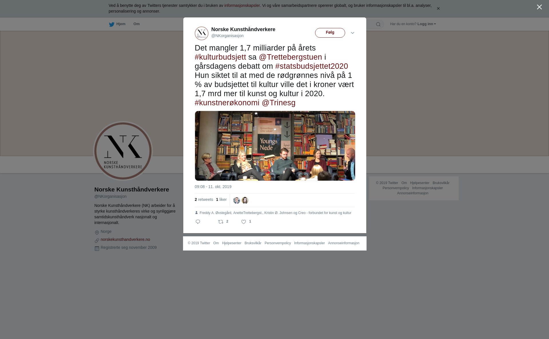RT @NKorganisasjon: Det mangler 1,7 milliarder på årets #kulturbudsjett sa @Trettebergstuen i gårsdagens debatt om #statsbudsjettet2020 Hun siktet til at med de rødgrønnes nivå på 1 % av budsjettet til kultur ville det i kroner vært 1,7 mrd mer til kunst og kultur i 2020. #kunstnerøkonomi @Trinesg https://t.co/ELQDwq8Yea