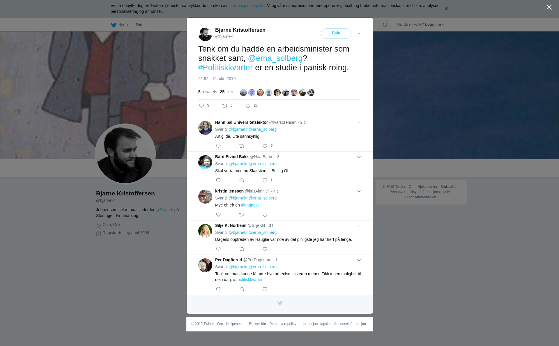 RT @bjarnekr: Tenk om du hadde en arbeidsminister som snakket sant, @erna_solberg? #Politiskkvarter er en studie i panisk roing.