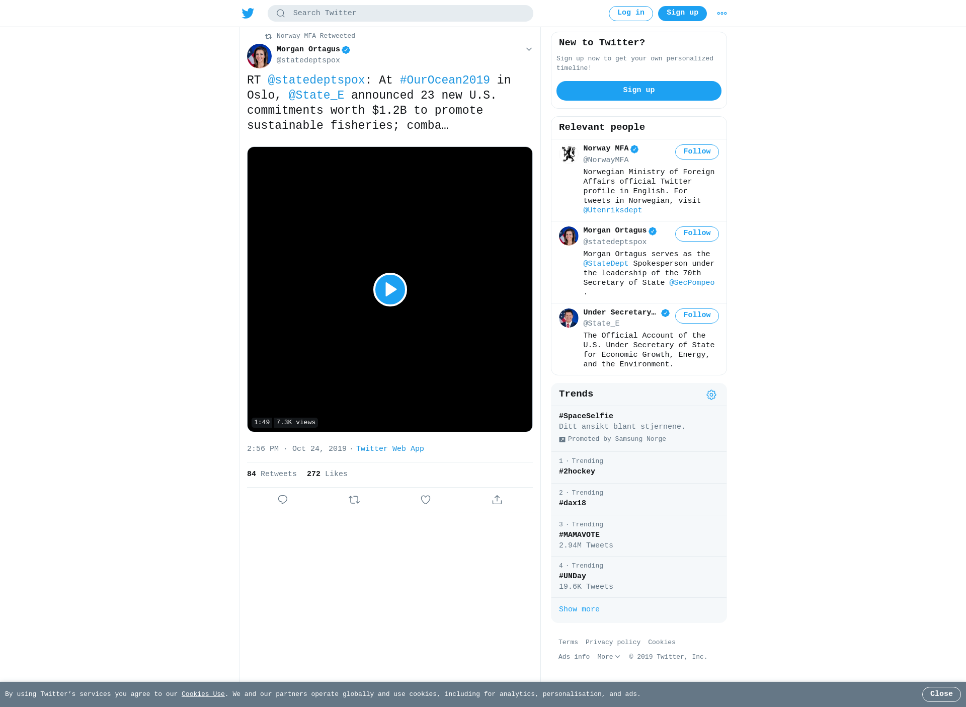 RT @statedeptspox: At #OurOcean2019 in Oslo, @State_E announced 23 new U.S. commitments worth $1.2B to promote sustainable fisheries; combat marine debris; and support marine science, observation, & exploration. Our global partnerships support a healthy and productive ocean. https://t.co/FScM4kZI5v