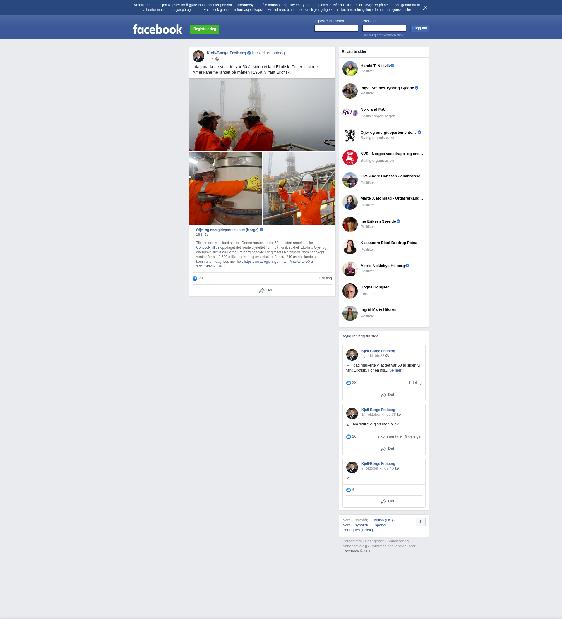 Tilbake der lykkeland startet. Denne høsten er det 50 år siden amerikanske ConocoPhillips oppdaget det første oljefeltet i drift på norsk sokkel: Ekofisk. Olje- og energiminister Kjell-Børge Freiberg besøkte i dag feltet i Nordsjøen, som har skapt verdier for ca. 2 500 milliarder kr – og sysselsetter folk fra 240 av alle landets kommuner i dag. Les mer her: https://www.regjeringen.no/no/aktuelt/markerte-50-ar-siden-ekofisk-og-starten-pa-oljeeventyret/id2675049/