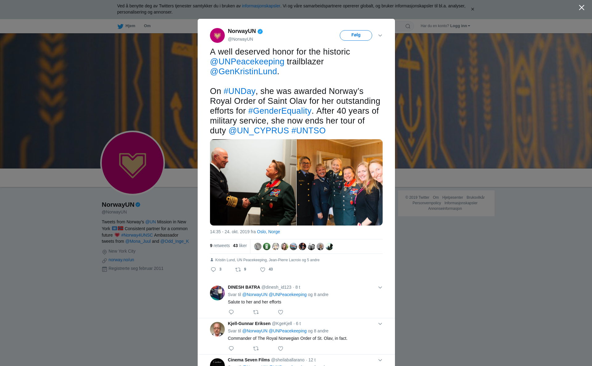 RT @NorwayUN: A well deserved honor for the historic @UNPeacekeeping trailblazer @GenKristinLund. On #UNDay, she was awarded Norway’s Roya…
