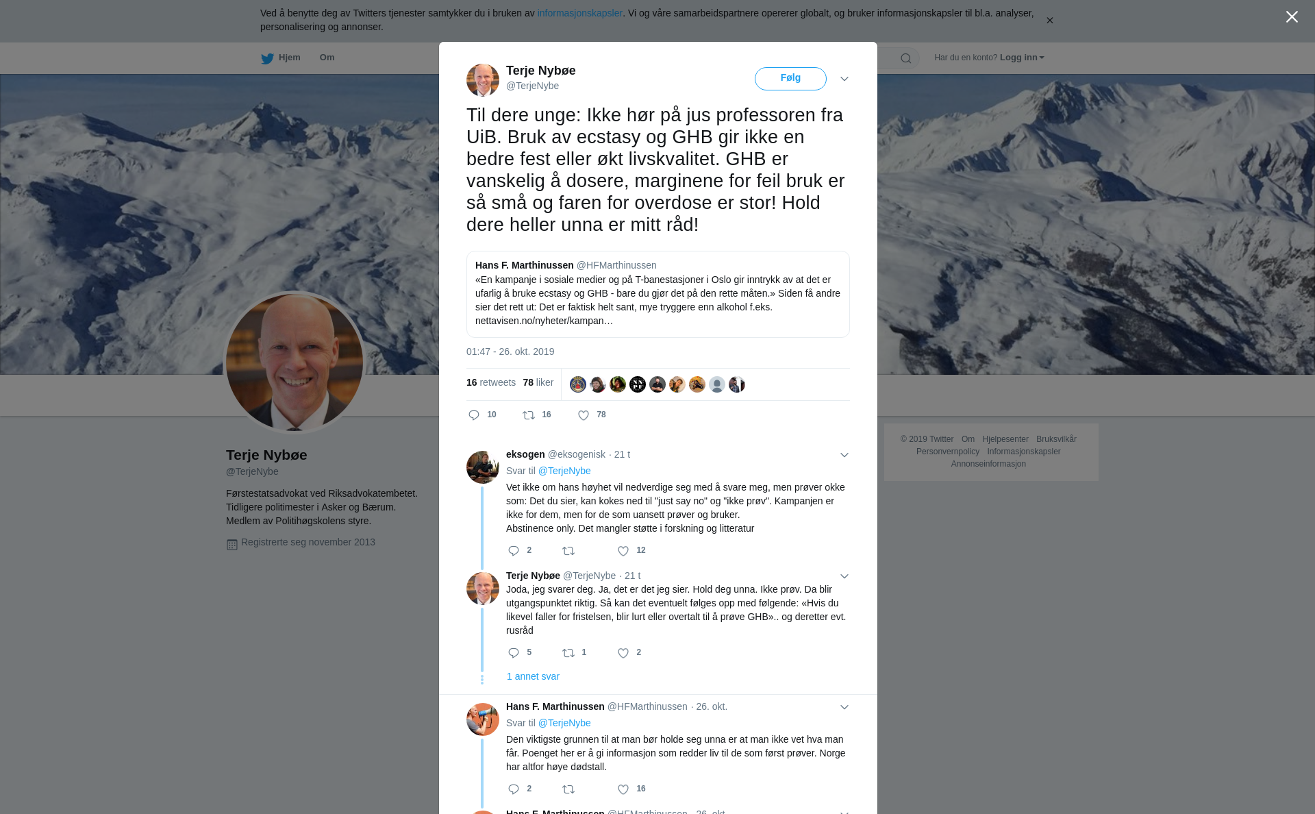 RT @TerjeNybe: Til dere unge: Ikke hør på jus professoren fra UiB. Bruk av ecstasy og GHB gir ikke en bedre fest eller økt livskvalitet. GHB er vanskelig å dosere, marginene for feil bruk er så små og faren for overdose er stor! Hold dere heller unna er mitt råd! https://t.co/tR8Kj34ypv