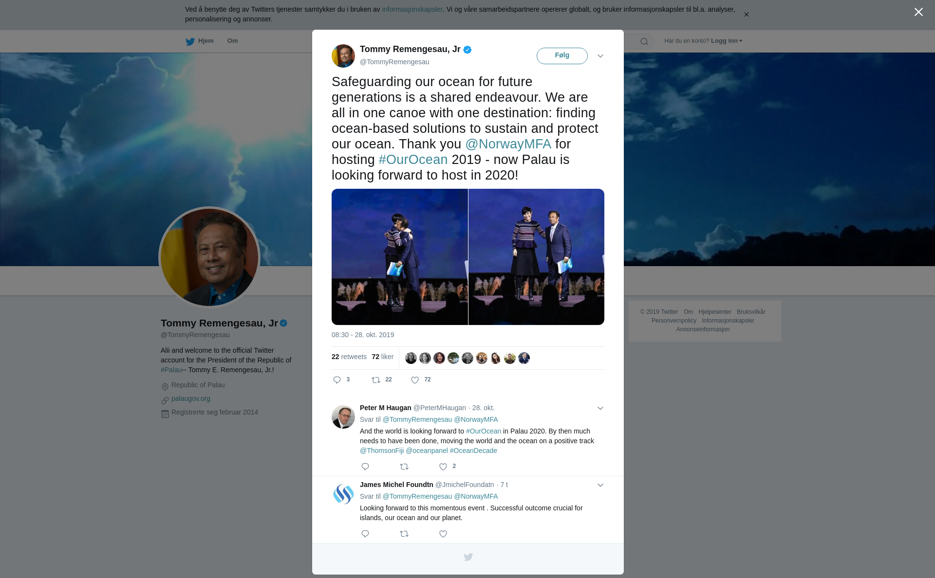 RT @TommyRemengesau: Safeguarding our ocean for future generations is a shared endeavour. We are all in one canoe with one destination: finding ocean-based solutions to sustain and protect our ocean. Thank you @NorwayMFA for hosting #OurOcean 2019 - now Palau is looking forward to host in 2020! https://t.co/xuiu2GJ7MO