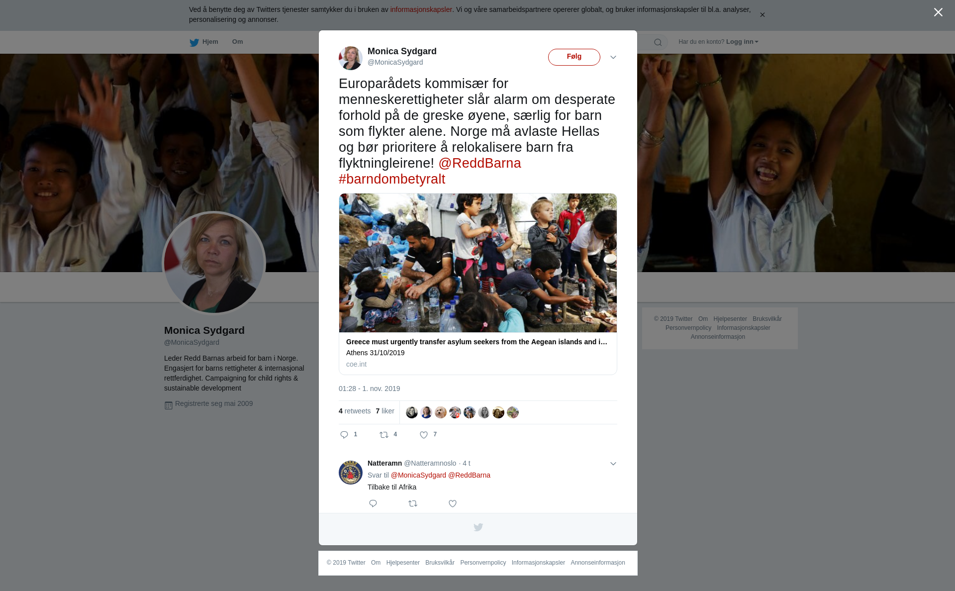 RT @MonicaSydgard: Europarådets kommisær for menneskerettigheter slår alarm om desperate forhold på de greske øyene, særlig for barn som flykter alene. Norge må avlaste Hellas og bør prioritere å relokalisere barn fra flyktningleirene! @ReddBarna #barndombetyralt https://t.co/IJATwzHq81