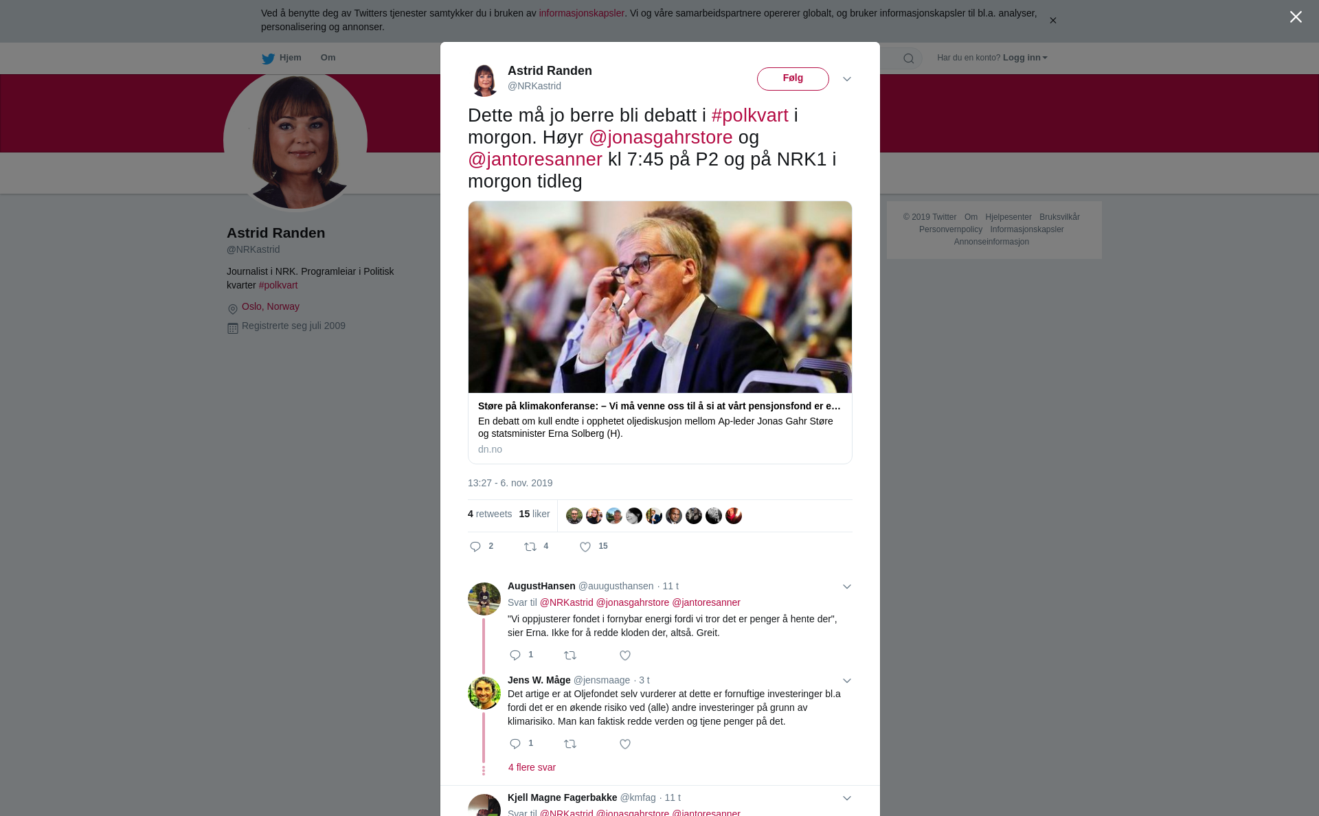 RT @NRKastrid: Dette må jo berre bli debatt i #polkvart i morgon. Høyr @jonasgahrstore og @jantoresanner kl 7:45 på P2 og på NRK1 i morgon tidleg https://t.co/aBG8cBrdnj