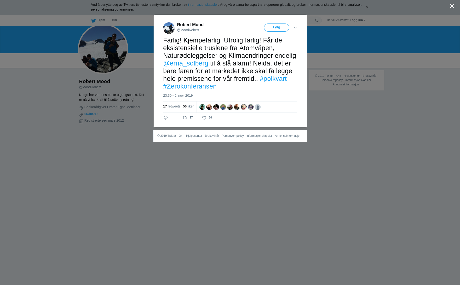 RT @MoodRobert: Farlig! Kjempefarlig! Utrolig farlig! Får de eksistensielle truslene fra Atomvåpen, Naturødeleggelser og Klimaendringer endelig @erna_solberg til å slå alarm! Neida, det er bare faren for at markedet ikke skal få legge hele premissene for vår fremtid.. #polkvart #Zerokonferansen