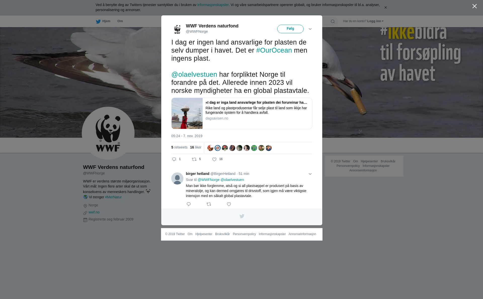 RT @WWFNorge: I dag er ingen land ansvarlige for plasten de selv dumper i havet. Det er #OurOcean men ingens plast. @olaelvestuen har forp…