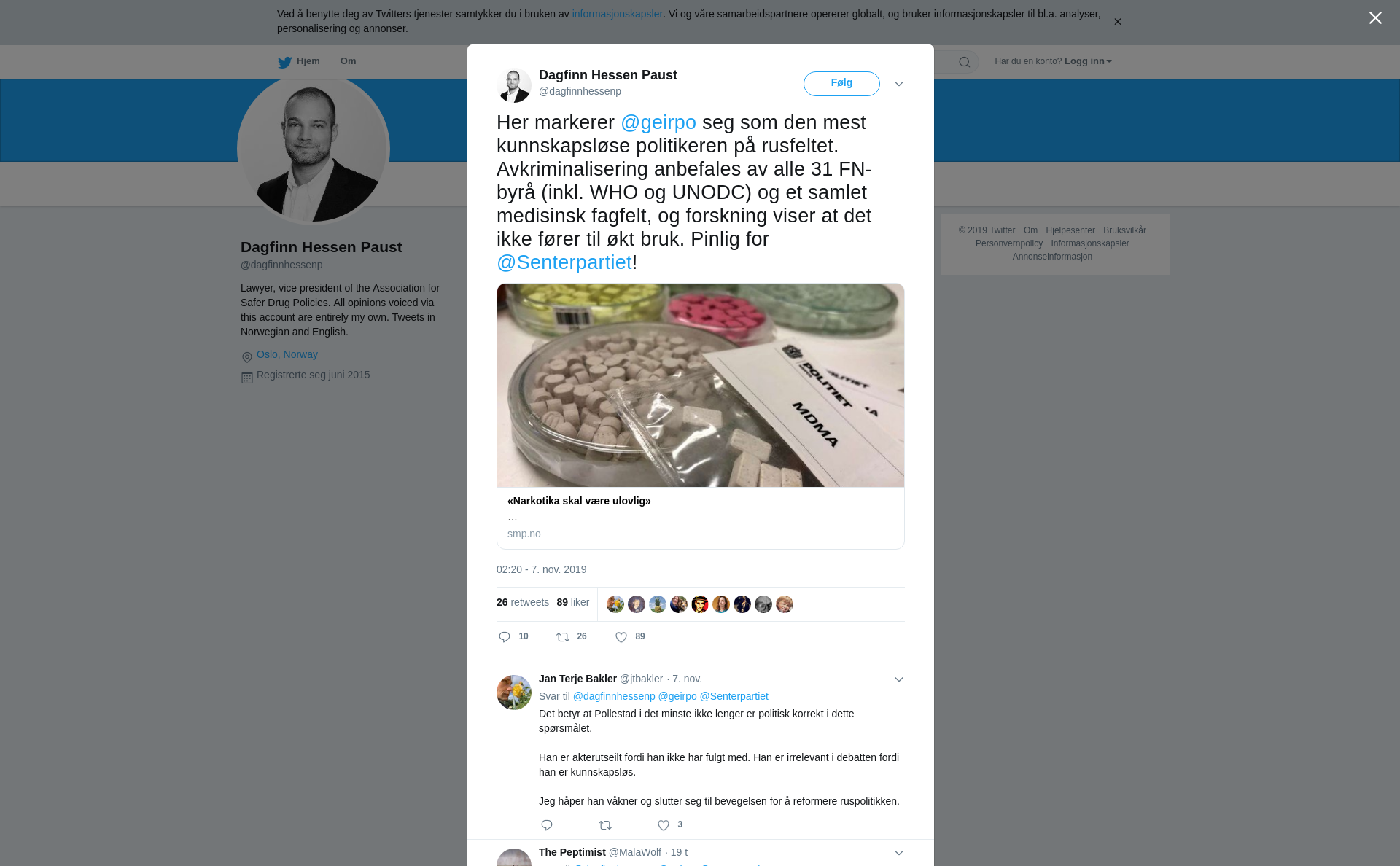 RT @dagfinnhessenp: Her markerer @geirpo seg som den mest kunnskapsløse politikeren på rusfeltet. Avkriminalisering anbefales av alle 31 FN-byrå (inkl. WHO og UNODC) og et samlet medisinsk fagfelt, og forskning viser at det ikke fører til økt bruk. Pinlig for @Senterpartiet!