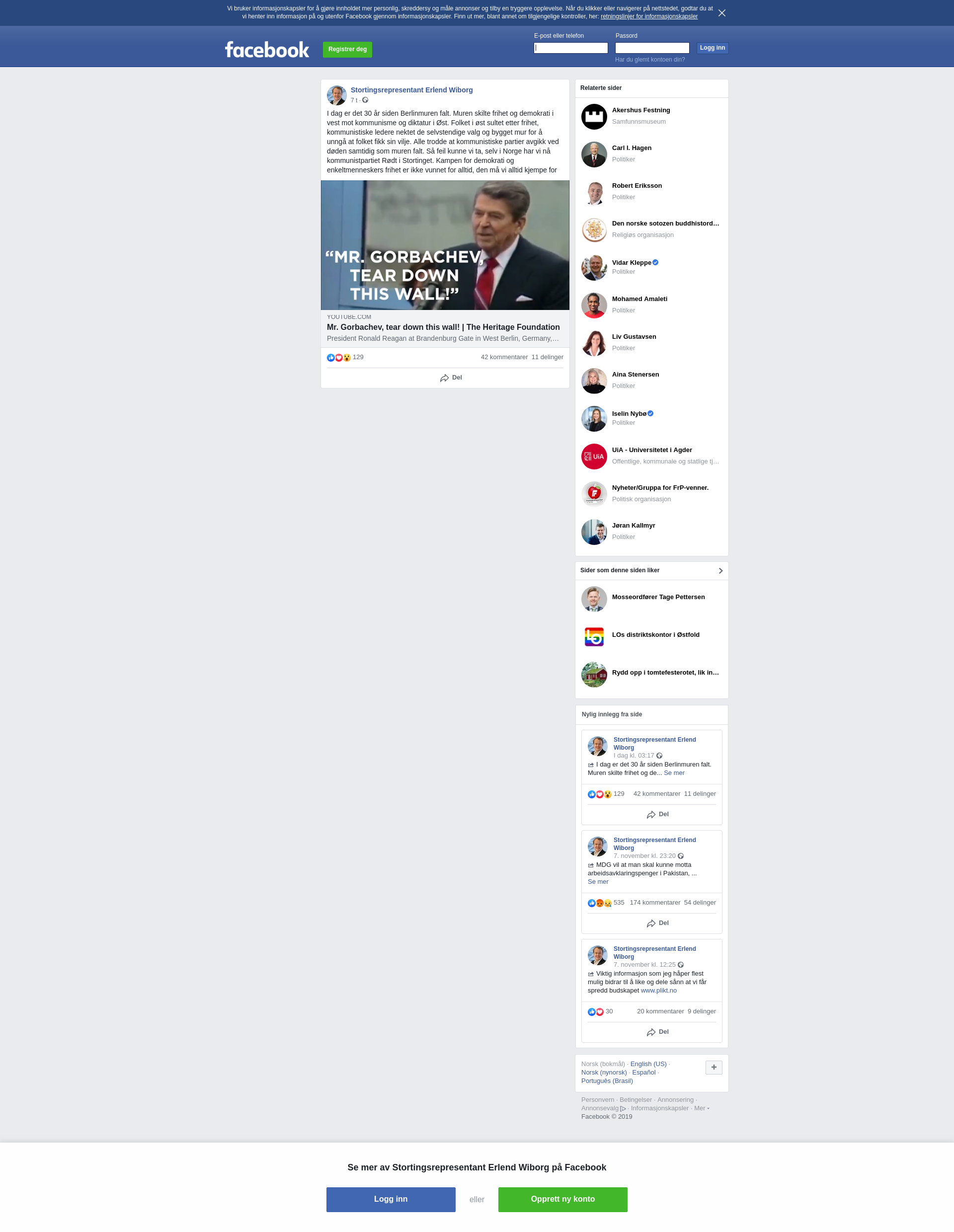 I dag er det 30 år siden Berlinmuren falt. Muren skilte frihet og demokrati i vest mot kommunisme og diktatur i Øst. Folket i øst sultet etter frihet, kommunistiske ledere nektet de selvstendige valg og bygget mur for å unngå at folket fikk sin vilje. Alle trodde at kommunistiske partier avgikk ved døden samtidig som muren falt. Så feil kunne vi ta, selv i Norge har vi nå kommunistpartiet Rødt i Stortinget. Kampen for demokrati og enkeltmenneskers frihet er ikke vunnet for alltid, den må vi alltid kjempe for