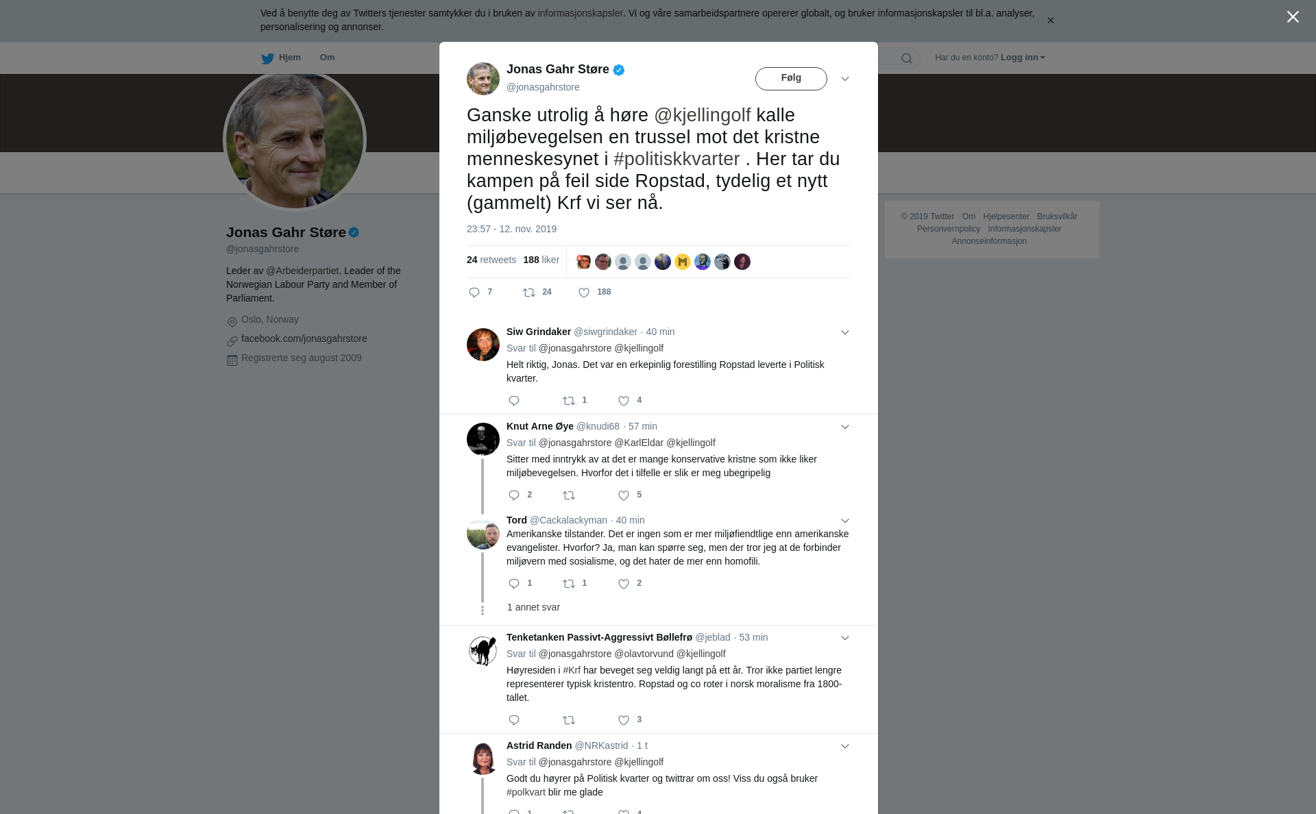 RT @jonasgahrstore: Ganske utrolig å høre @kjellingolf kalle miljøbevegelsen en trussel mot det kristne menneskesynet i #politiskkvarter . Her tar du kampen på feil side Ropstad, tydelig et nytt (gammelt) Krf vi ser nå.