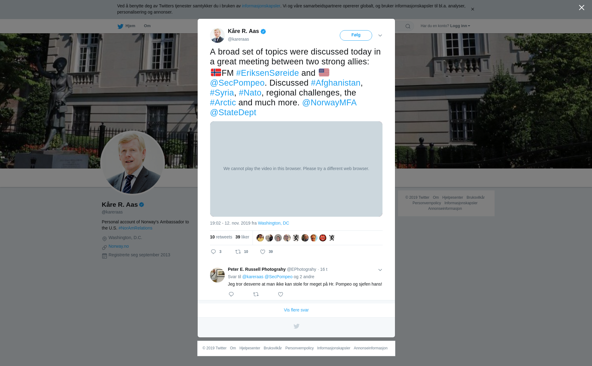 RT @kareraas: A broad set of topics were discussed today in a great meeting between two strong allies: 🇳🇴FM #EriksenSøreide and 🇺🇸@SecPompeo. Discussed #Afghanistan, #Syria, #Nato, regional challenges, the #Arctic and much more. @NorwayMFA @StateDept https://t.co/cC3ARsmAit