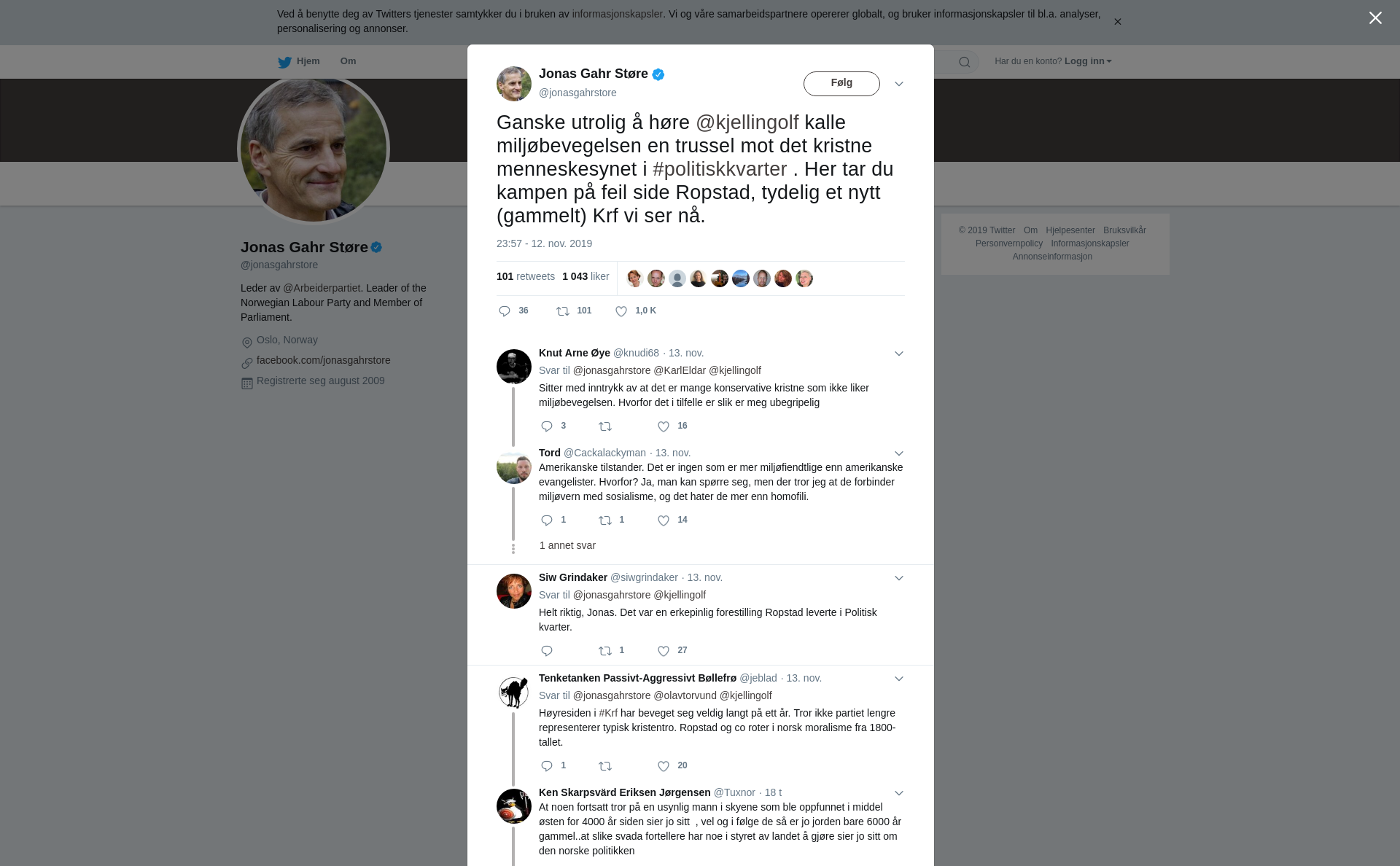 RT @jonasgahrstore: Ganske utrolig å høre @kjellingolf kalle miljøbevegelsen en trussel mot det kristne menneskesynet i #politiskkvarter . Her tar du kampen på feil side Ropstad, tydelig et nytt (gammelt) Krf vi ser nå.