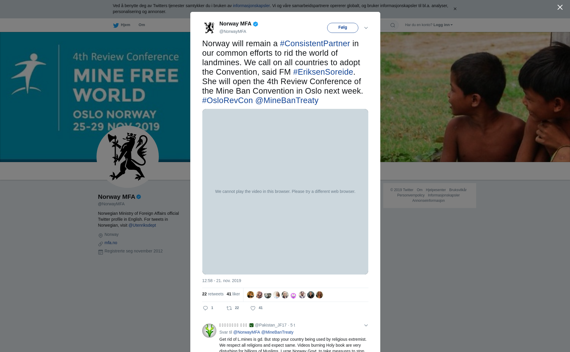 Norway will remain a #ConsistentPartner in our common efforts to rid the world of landmines. We call on all countries to adopt the Convention, said FM #EriksenSoreide. She will open the 4th Review Conference of the Mine Ban Convention in Oslo next week. #OsloRevCon @MineBanTreaty https://t.co/f71bzreyFv