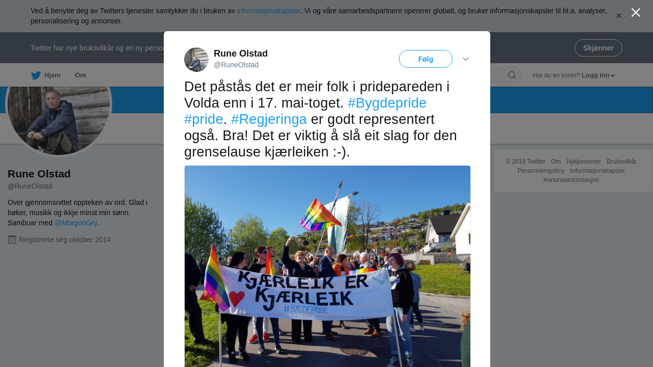 RT @RuneOlstad: Det påstås det er meir folk i pridepareden i Volda enn i 17. mai-toget. #Bygdepride #pride. #Regjeringa er godt rep… https://t.co/z5wTwkLYe8