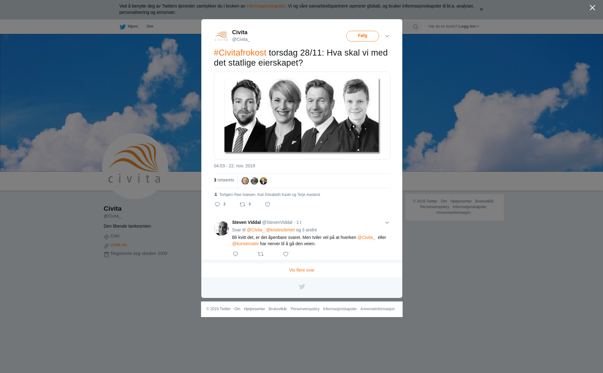 RT @Civita_: #Civitafrokost torsdag 28/11: Hva skal vi med det statlige eierskapet? https://t.co/iY7X5DVcWk