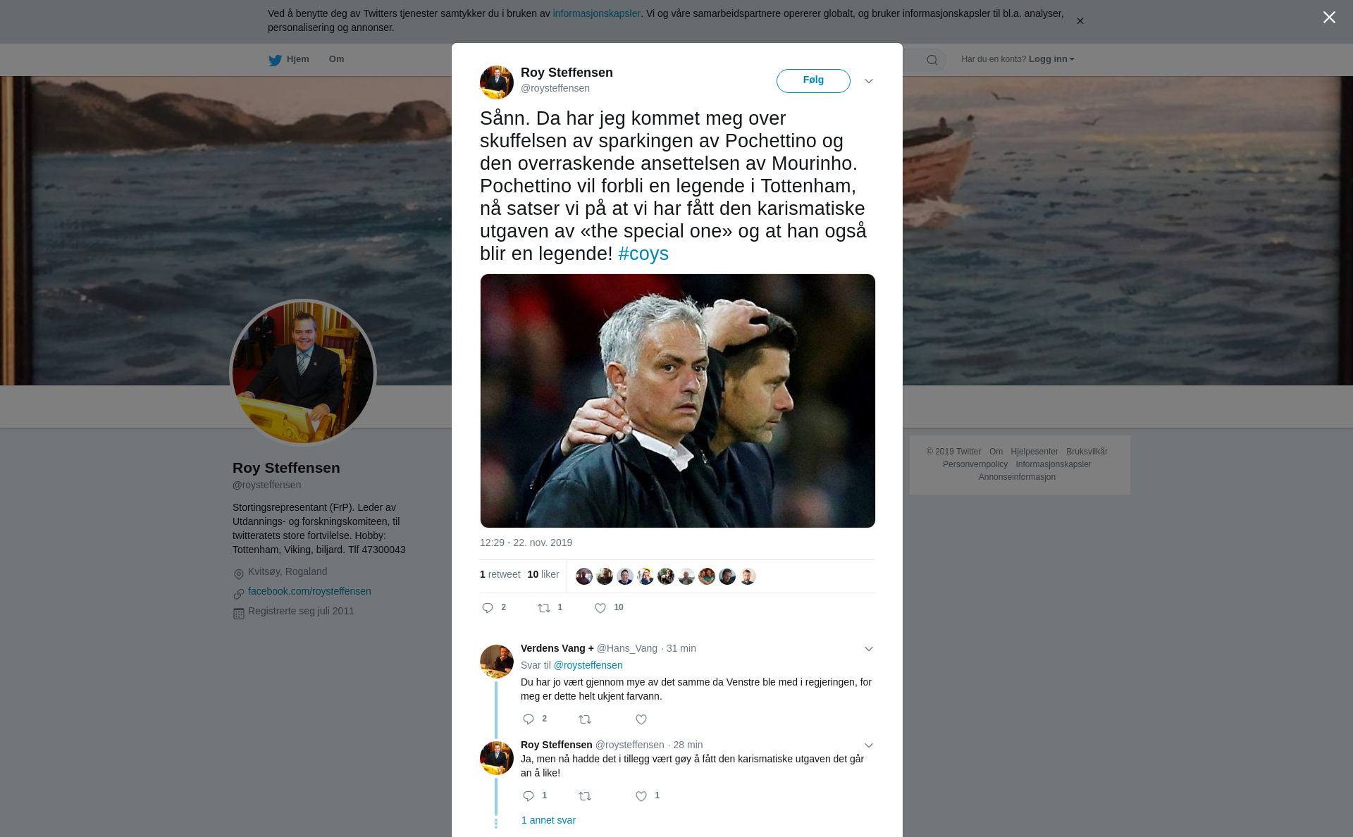 Sånn. Da har jeg kommet meg over skuffelsen av sparkingen av Pochettino og den overraskende ansettelsen av Mourinho. Pochettino vil forbli en legende i Tottenham, nå satser vi på at vi har fått den karismatiske utgaven av «the special one» og at han også blir en legende! #coys https://t.co/7elMcLf7Ng
