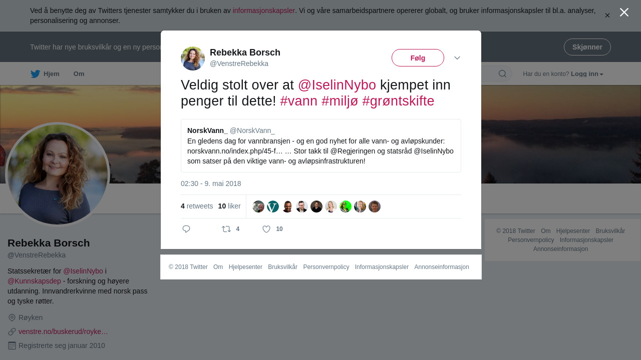 “En gledens dag for vannbransjen - og en god nyhet for alle vann- og avløpskunder: https://t.co/KDIYUzVpuh … Stor takk til @Regjeringen og statsråd @IselinNybo som satser på den viktige vann- og avløpsinfrastrukturen!”
