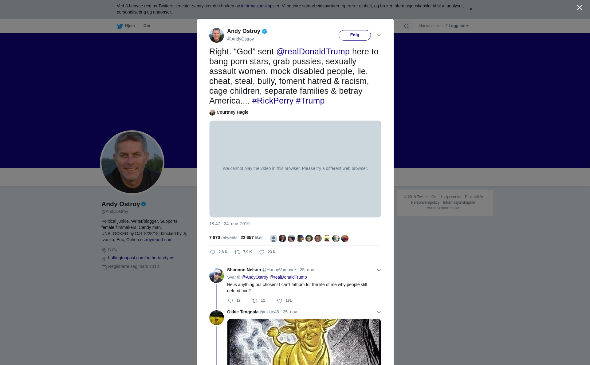 RT @AndyOstroy: Right. “God” sent @realDonaldTrump here to bang porn stars, grab pussies, sexually assault women, mock disabled people, lie, cheat, steal, bully, foment hatred & racism, cage children, separate families & betray America.... #RickPerry #Trump https://t.co/Zd8UElbqYo