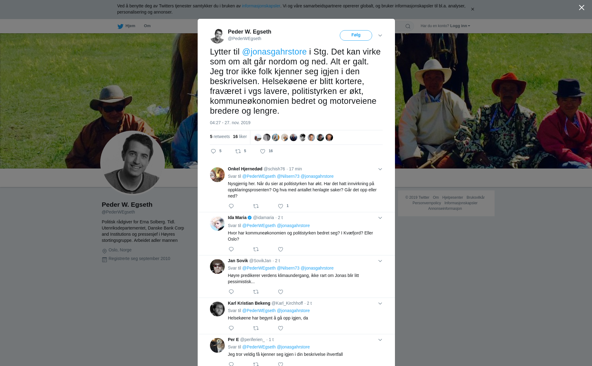 RT @PederWEgseth: Lytter til @jonasgahrstore i Stg. Det kan virke som om alt går nordom og ned. Alt er galt. Jeg tror ikke folk kjenner seg igjen i den beskrivelsen. Helsekøene er blitt kortere, fraværet i vgs lavere, politistyrken er økt, kommuneøkonomien bedret og motorveiene bredere og lengre.