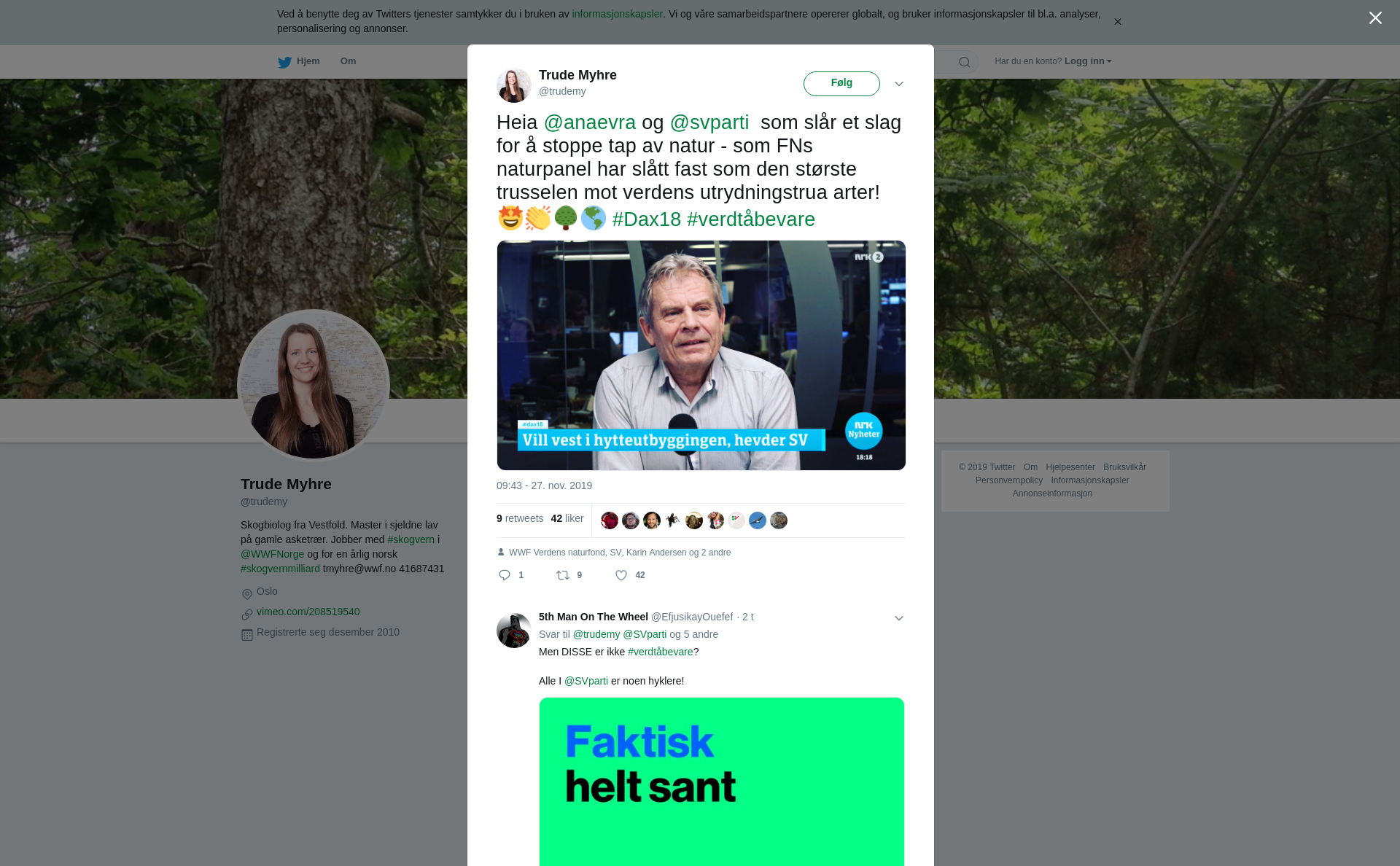 RT @trudemy: Heia @anaevra og @svparti som slår et slag for å stoppe tap av natur - som FNs naturpanel har slått fast som den største trusselen mot verdens utrydningstrua arter! 🤩👏🌳🌎 #Dax18 #verdtåbevare https://t.co/FhfMXl0nMy