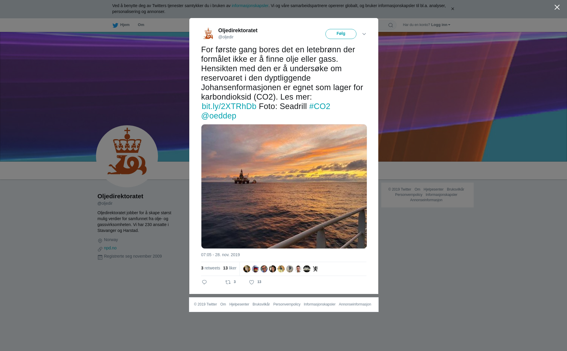 RT @oljedir: For første gang bores det en letebrønn der formålet ikke er å finne olje eller gass. Hensikten med den er å undersøke om reservoaret i den dyptliggende Johansenformasjonen er egnet som lager for karbondioksid (CO2). Les mer: https://t.co/KUqALaUqdt Foto: Seadrill #CO2 @oeddep https://t.co/nMW9zvm9hS