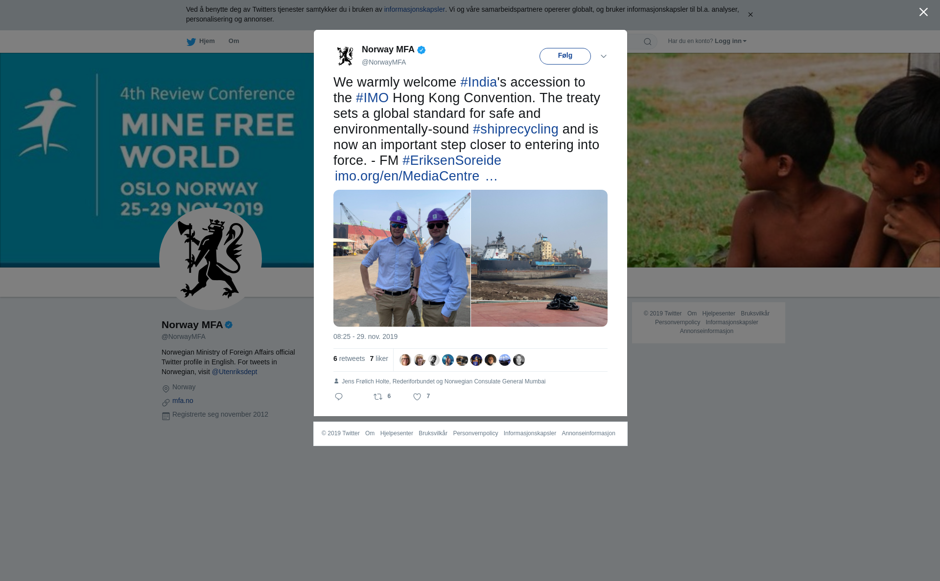 We warmly welcome #India's accession to the #IMO Hong Kong Convention. The treaty sets a global standard for safe and environmentally-sound #shiprecycling and is now an important step closer to entering into force. - FM #EriksenSoreide https://t.co/ZoBOdxdqgC https://t.co/qt3gdPpcnw