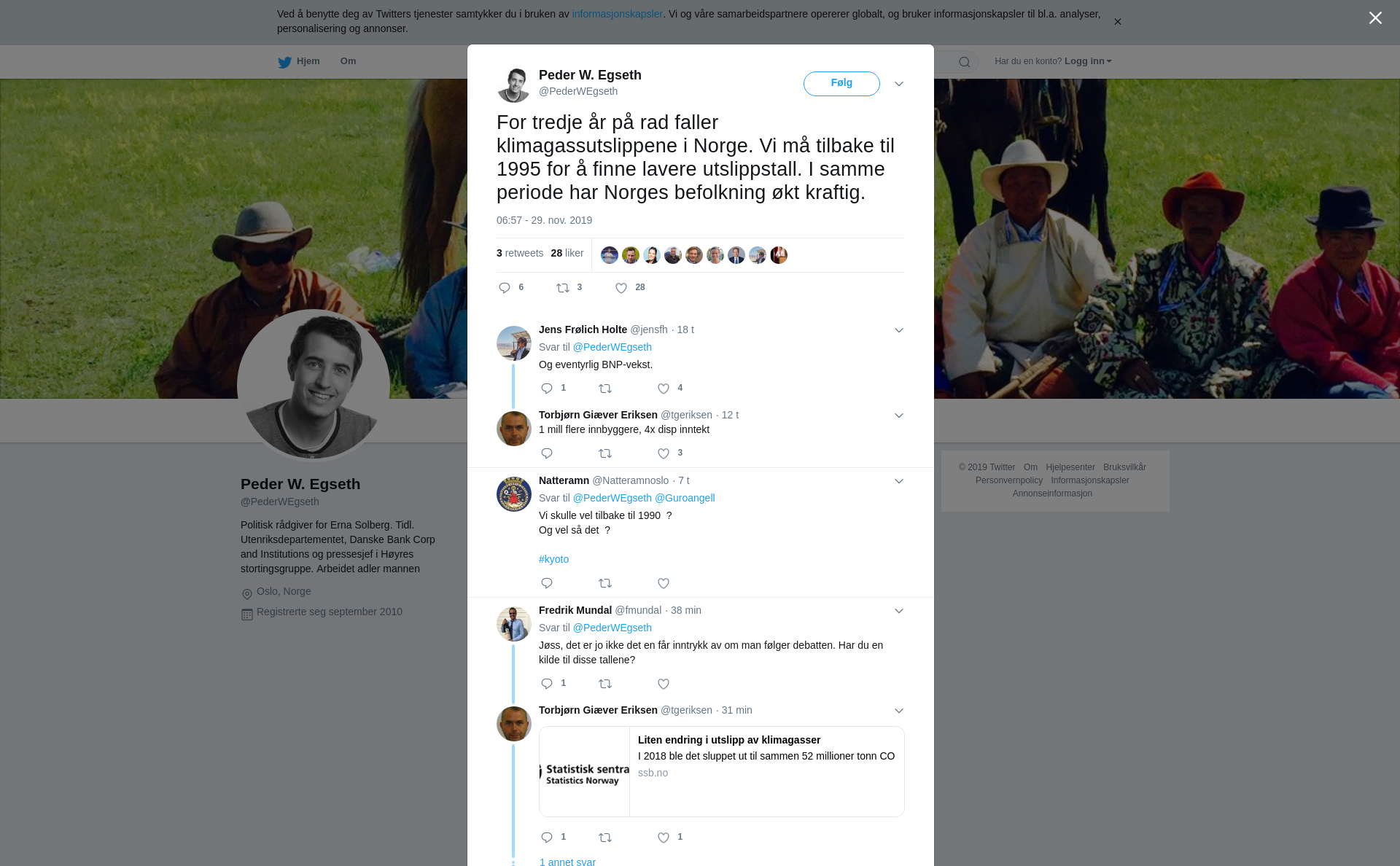 RT @PederWEgseth: For tredje år på rad faller klimagassutslippene i Norge. Vi må tilbake til 1995 for å finne lavere utslippstall. I samme periode har Norges befolkning økt kraftig.