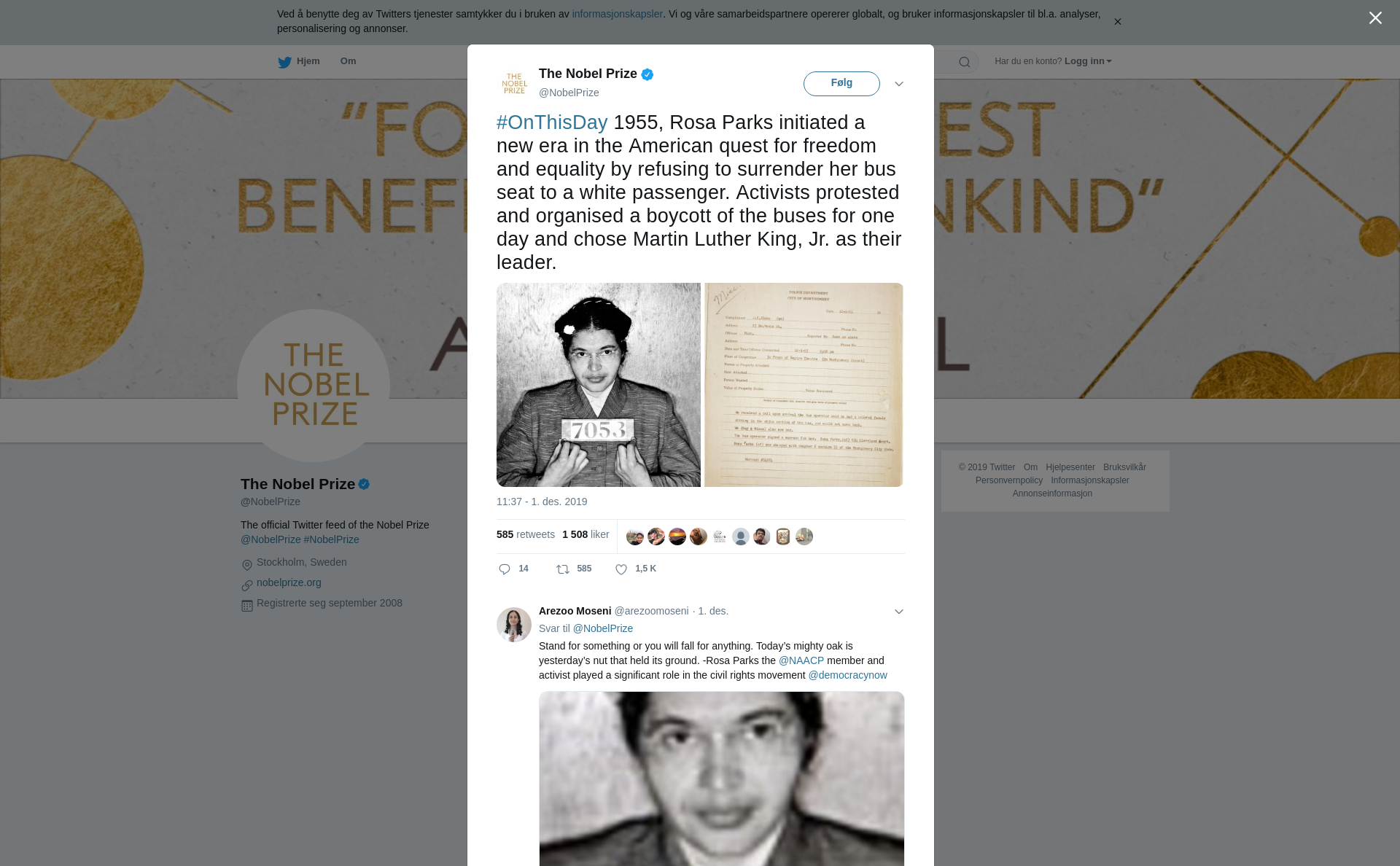 RT @NobelPrize: #OnThisDay 1955, Rosa Parks initiated a new era in the American quest for freedom and equality by refusing to surrender her bus seat to a white passenger. Activists protested and organised a boycott of the buses for one day and chose Martin Luther King, Jr. as their leader. https://t.co/ZrGpSbzdWz