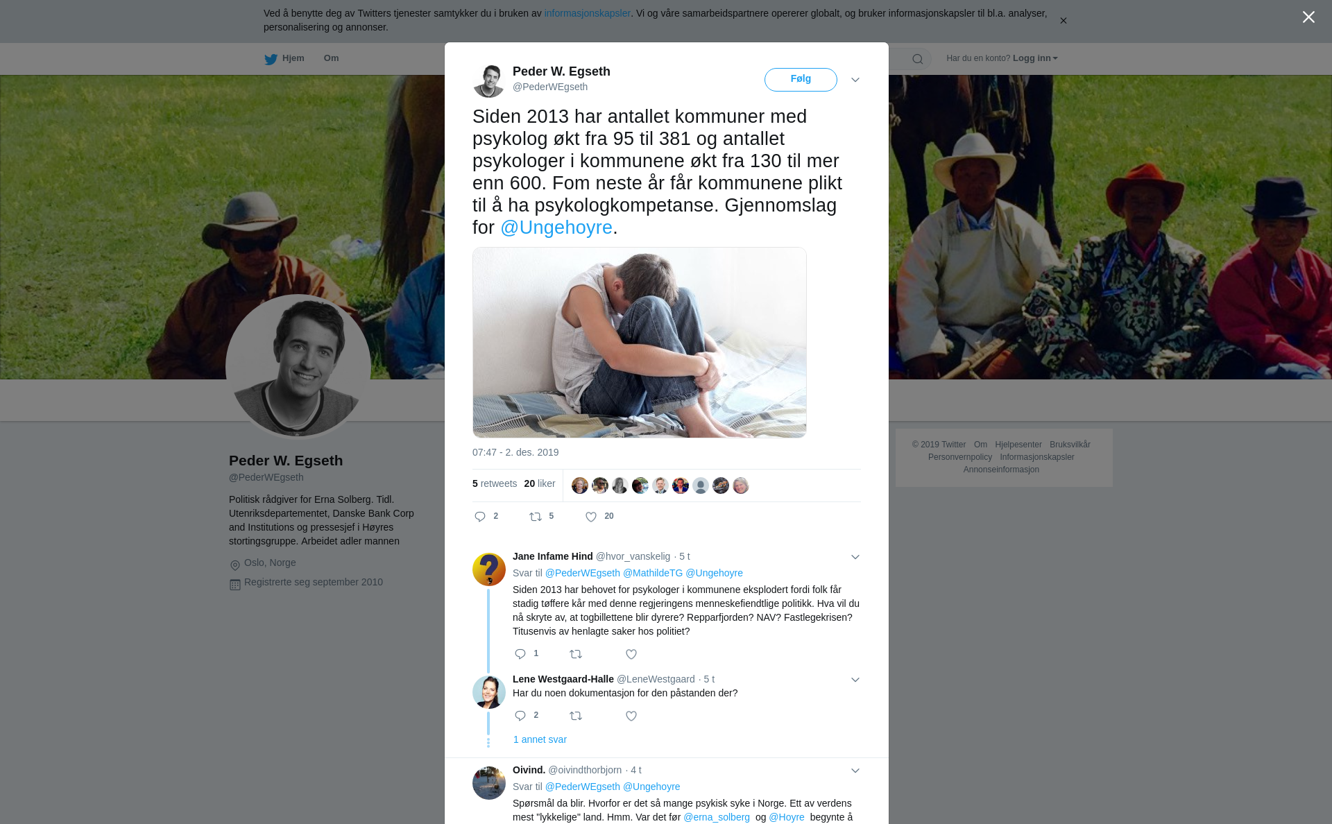 RT @PederWEgseth: Siden 2013 har antallet kommuner med psykolog økt fra 95 til 381 og antallet psykologer i kommunene økt fra 130 til mer enn 600. Fom neste år får kommunene plikt til å ha psykologkompetanse. Gjennomslag for @Ungehoyre. https://t.co/km9sNRKbtU
