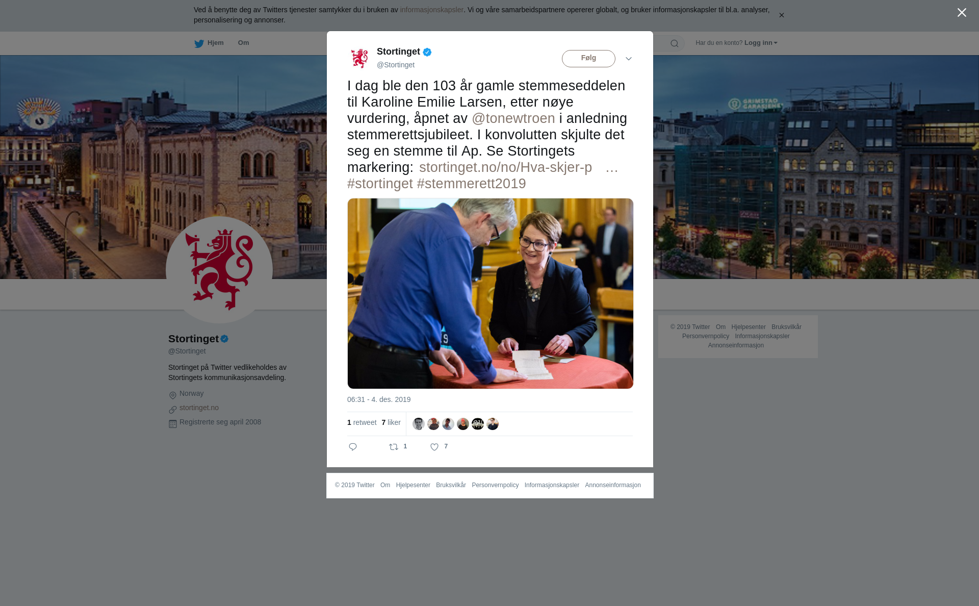 RT @Stortinget: I dag ble den 103 år gamle stemmeseddelen til Karoline Emilie Larsen, etter nøye vurdering, åpnet av @tonewtroen i anledning stemmerettsjubileet. I konvolutten skjulte det seg en stemme til Ap. Se Stortingets markering: https://t.co/5o7lXTcQNJ #stortinget #stemmerett2019 https://t.co/GcjBQPweFP