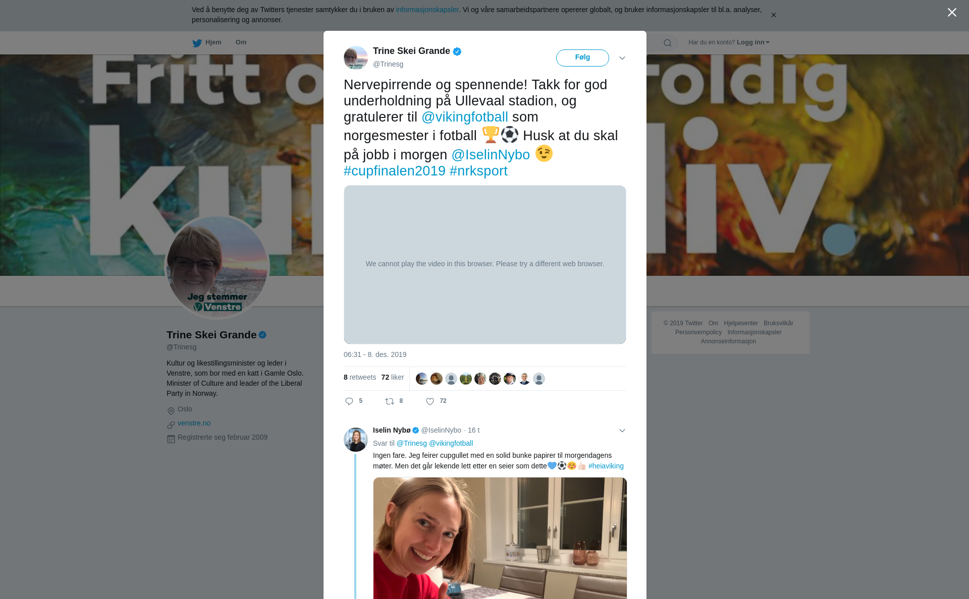 RT @Trinesg: Nervepirrende og spennende! Takk for god underholdning på Ullevaal stadion, og gratulerer til @vikingfotball som norgesmester i fotball 🏆⚽️ Husk at du skal på jobb i morgen @IselinNybo 😉 #cupfinalen2019 #nrksport https://t.co/UqyEybOU62