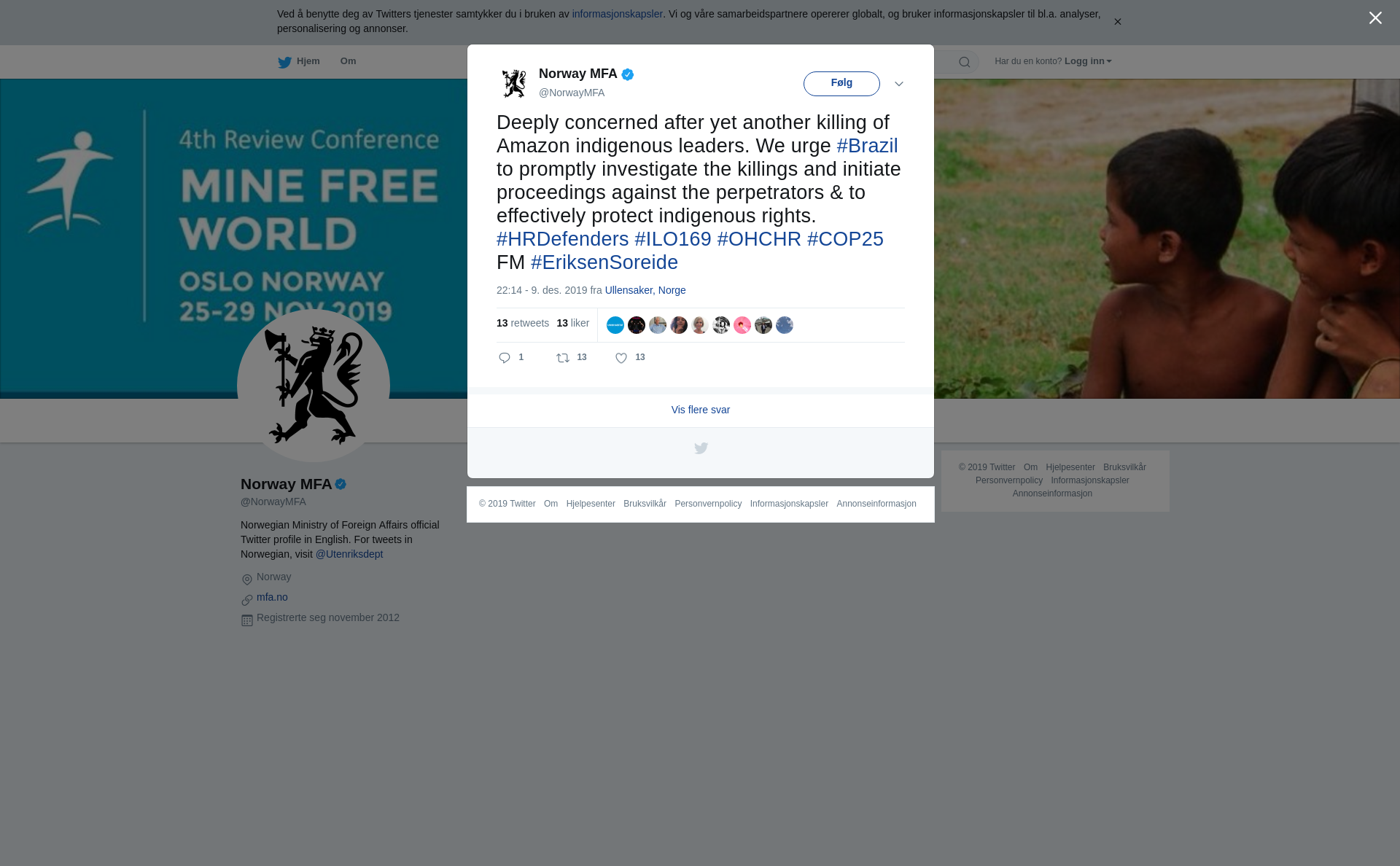 Deeply concerned after yet another killing of Amazon indigenous leaders. We urge #Brazil to promptly investigate the killings and initiate proceedings against the perpetrators & to effectively protect indigenous rights. #HRDefenders #ILO169 #OHCHR #COP25 FM #EriksenSoreide