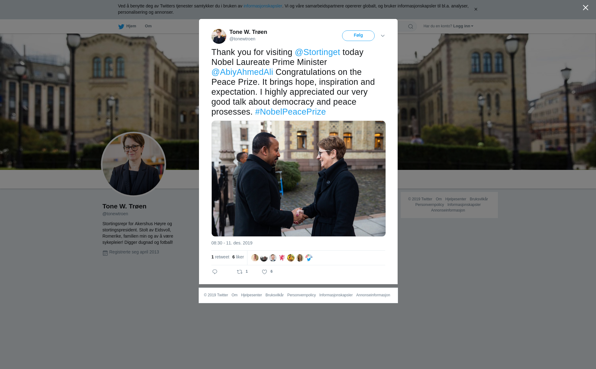 Thank you for visiting @Stortinget today Nobel Laureate Prime Minister @AbiyAhmedAli Congratulations on the Peace Prize. It brings hope, inspiration and expectation. I highly appreciated our very good talk about democracy and peace prosesses. #NobelPeacePrize https://t.co/EdRRsxObPQ