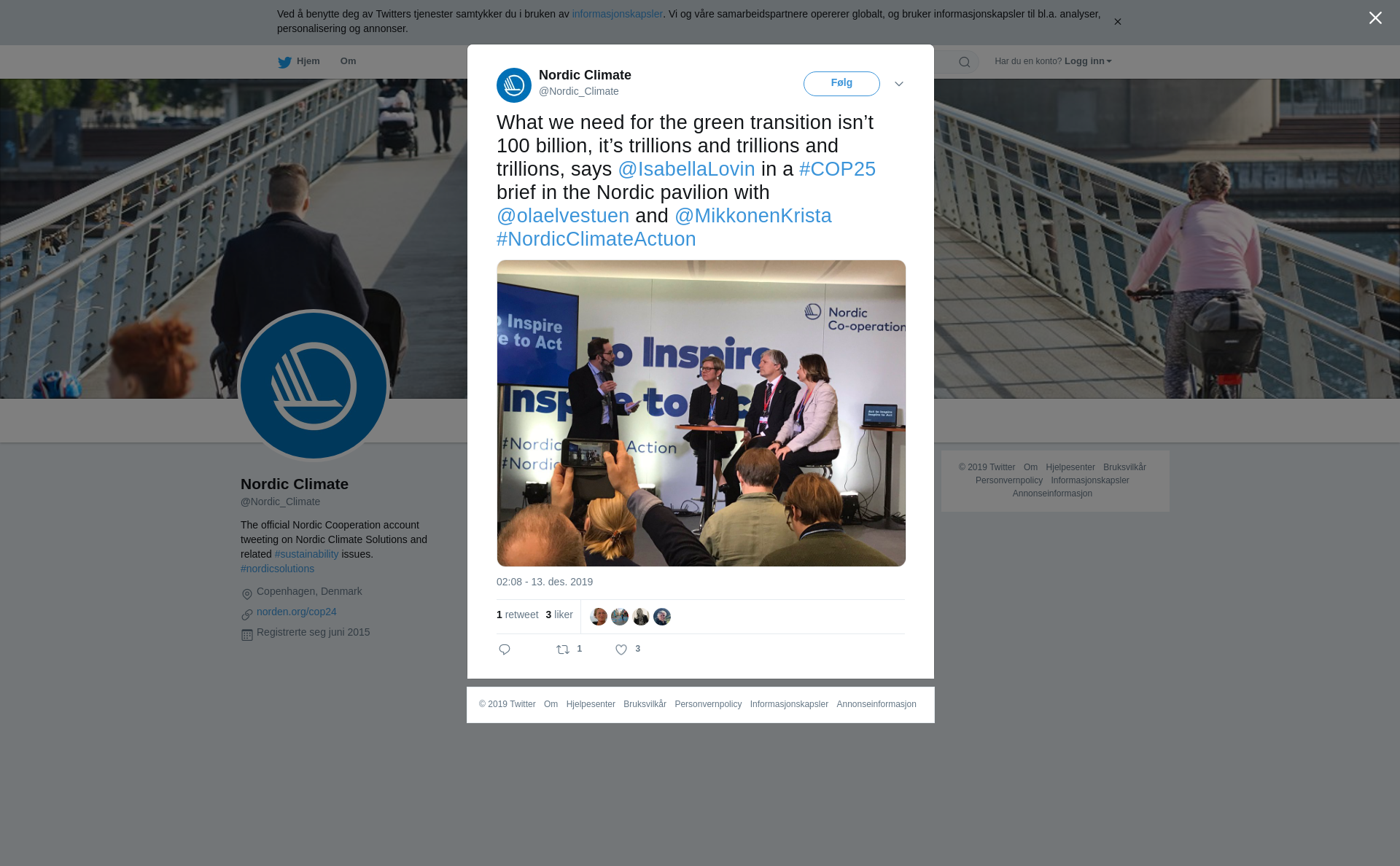 RT @Nordic_Climate: What we need for the green transition isn’t 100 billion, it’s trillions and trillions and trillions, says @IsabellaLovin in a #COP25 brief in the Nordic pavilion with @olaelvestuen and @MikkonenKrista #NordicClimateActuon https://t.co/D6TSnQWNaJ