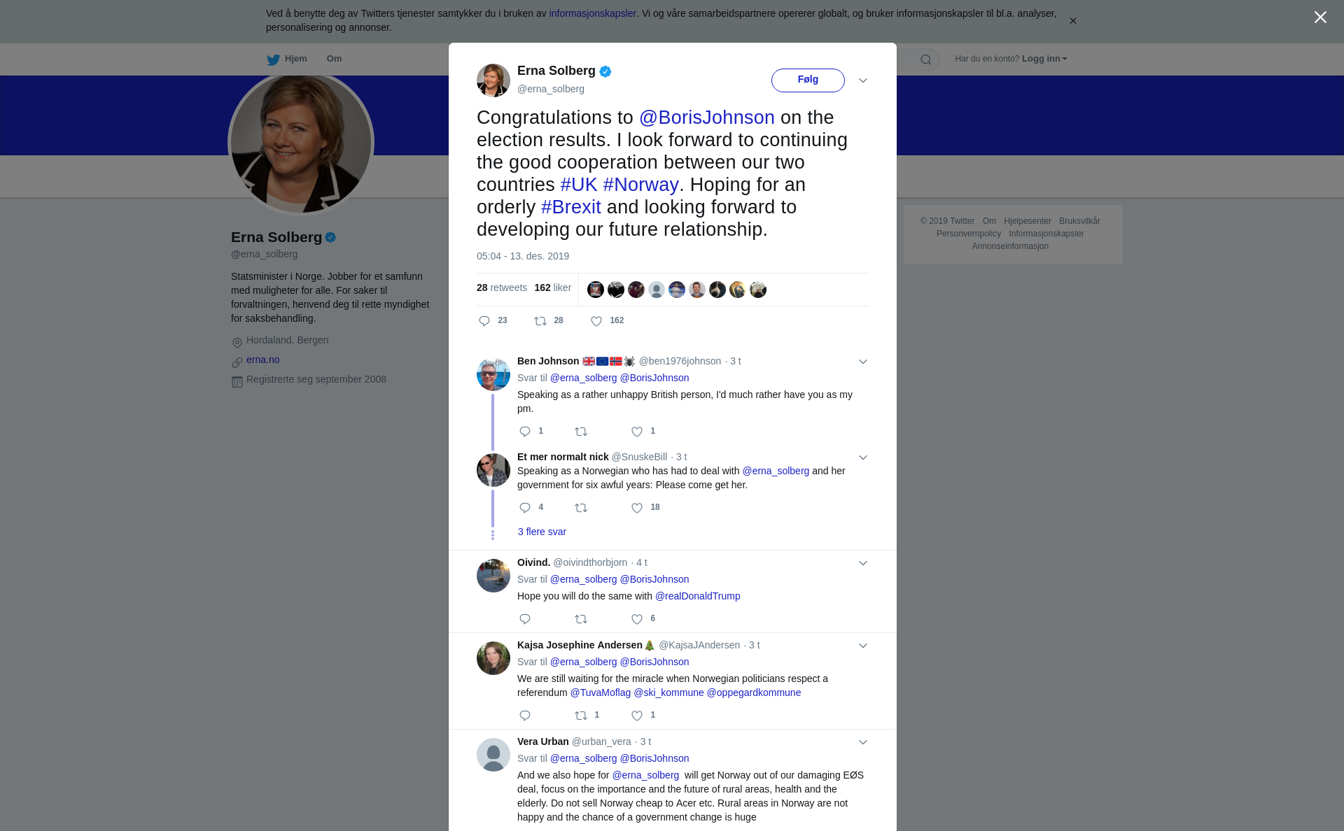 Congratulations to @BorisJohnson on the election results. I look forward to continuing the good cooperation between our two countries #UK #Norway. Hoping for an orderly #Brexit and looking forward to developing our future relationship.