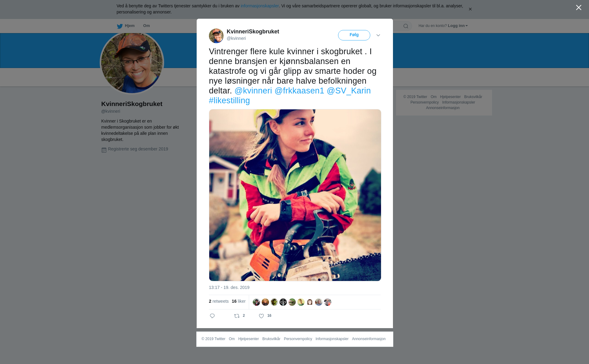 RT @kvinneri: Vintrenger flere kule kvinner i skogbruket . I denne bransjen er kjønnsbalansen en katastrofe og vi går glipp av smarte hoder og nye løsninger når bare halve befolkningen deltar. @kvinneri @frkkaasen1 @SV_Karin #likestilling https://t.co/QxUkL30Omy