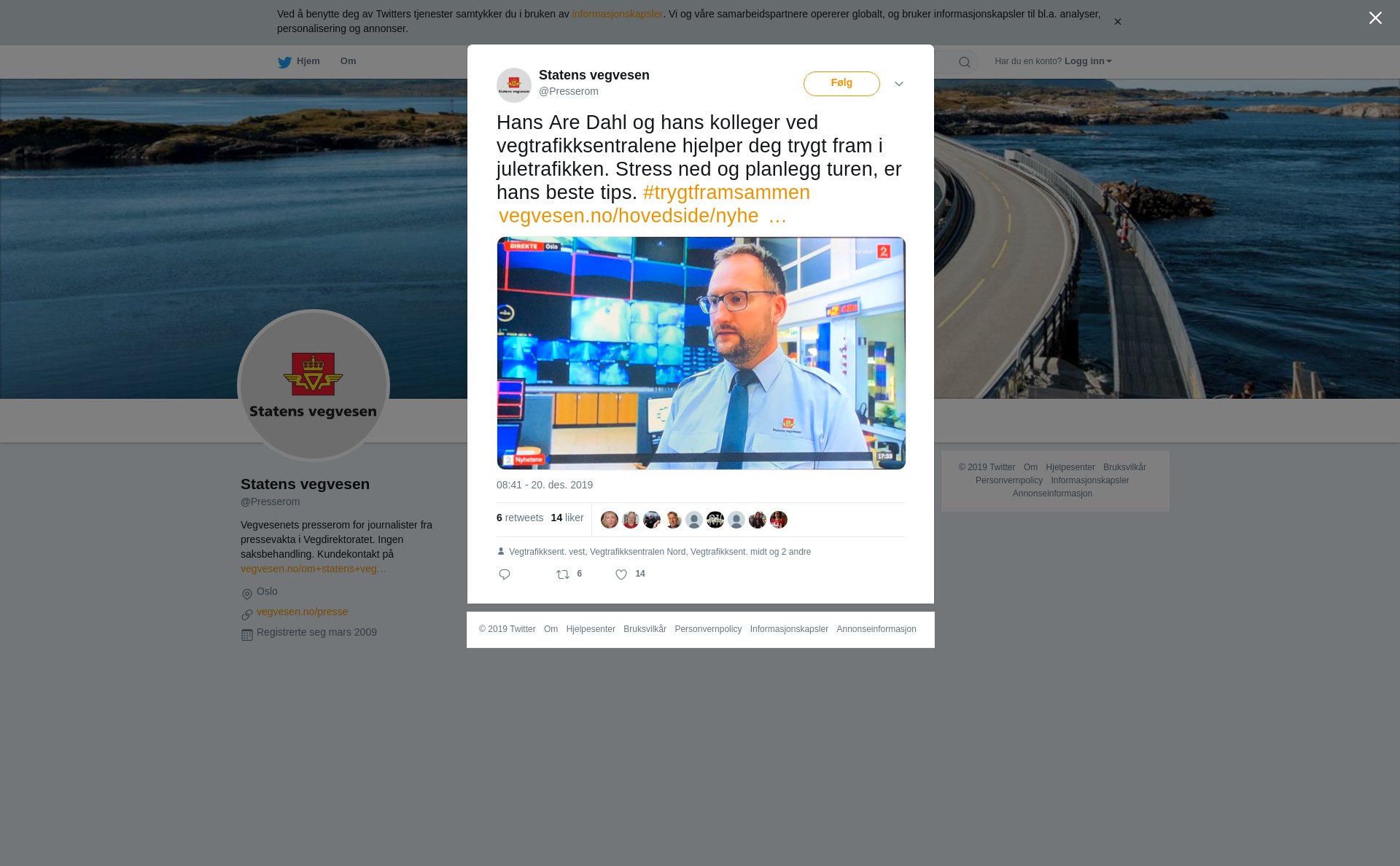 RT @Presserom: Hans Are Dahl og hans kolleger ved vegtrafikksentralene hjelper deg trygt fram i juletrafikken. Stress ned og planlegg turen, er hans beste tips. #trygtframsammen https://t.co/aLRWanob5B https://t.co/mPii1qJLSh