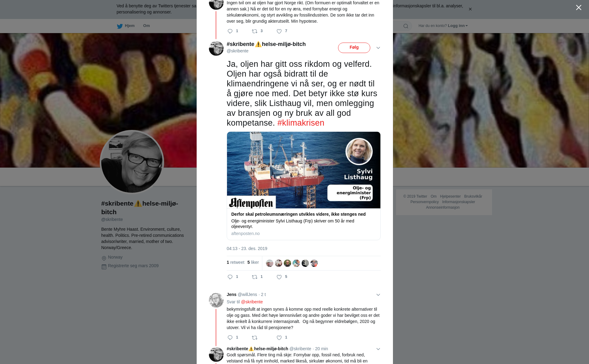 RT @skribente: Ja, oljen har gitt oss rikdom og velferd. Oljen har også bidratt til de klimaendringene vi nå ser, og er nødt til å gjøre noe med. Det betyr ikke stø kurs videre, slik Listhaug vil, men omlegging av bransjen og ny bruk av all god kompetanse. #klimakrisen https://t.co/XIZXa1BMaU