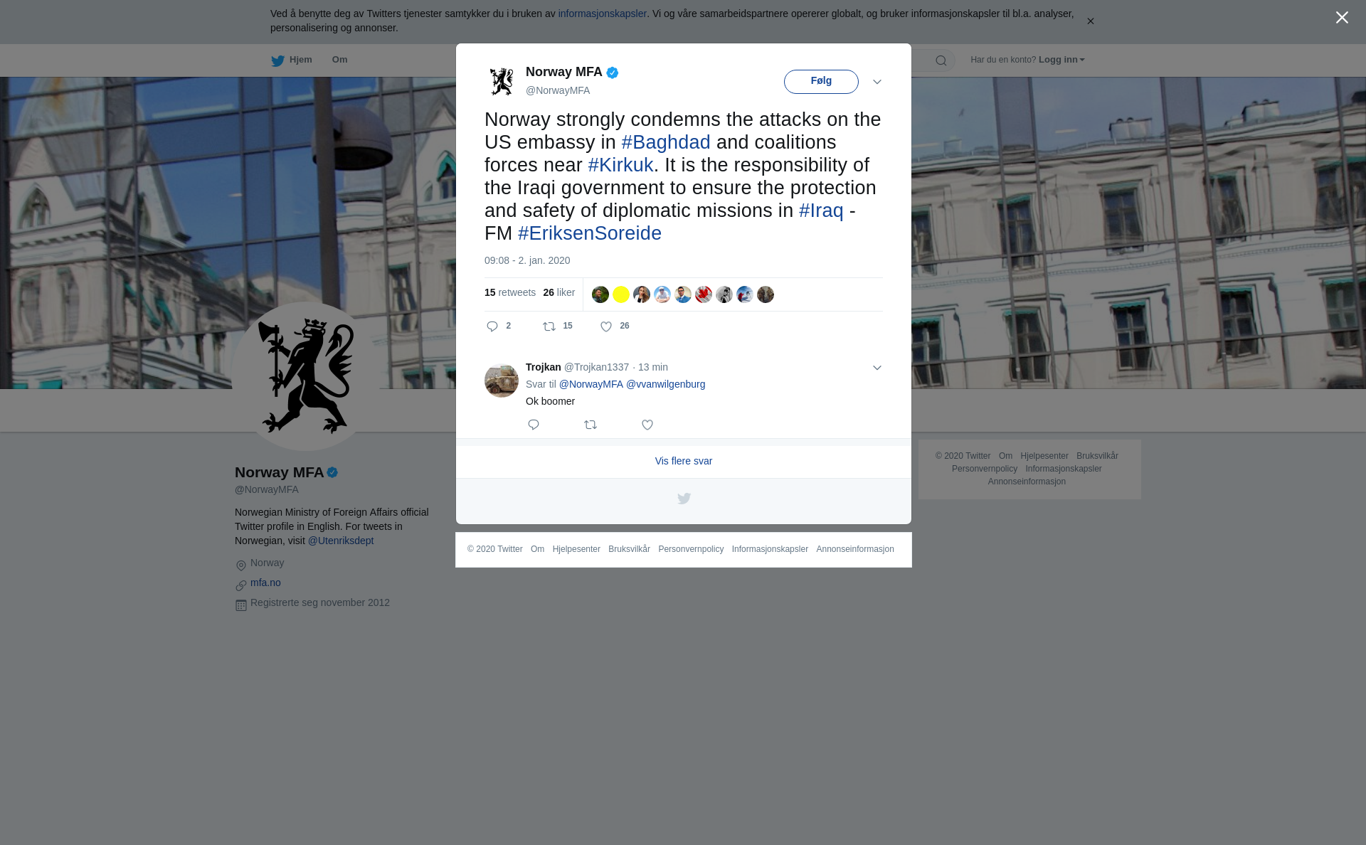 Norway strongly condemns the attacks on the US embassy in #Baghdad and coalitions forces near #Kirkuk. It is the responsibility of the Iraqi government to ensure the protection and safety of diplomatic missions in #Iraq - FM #EriksenSoreide