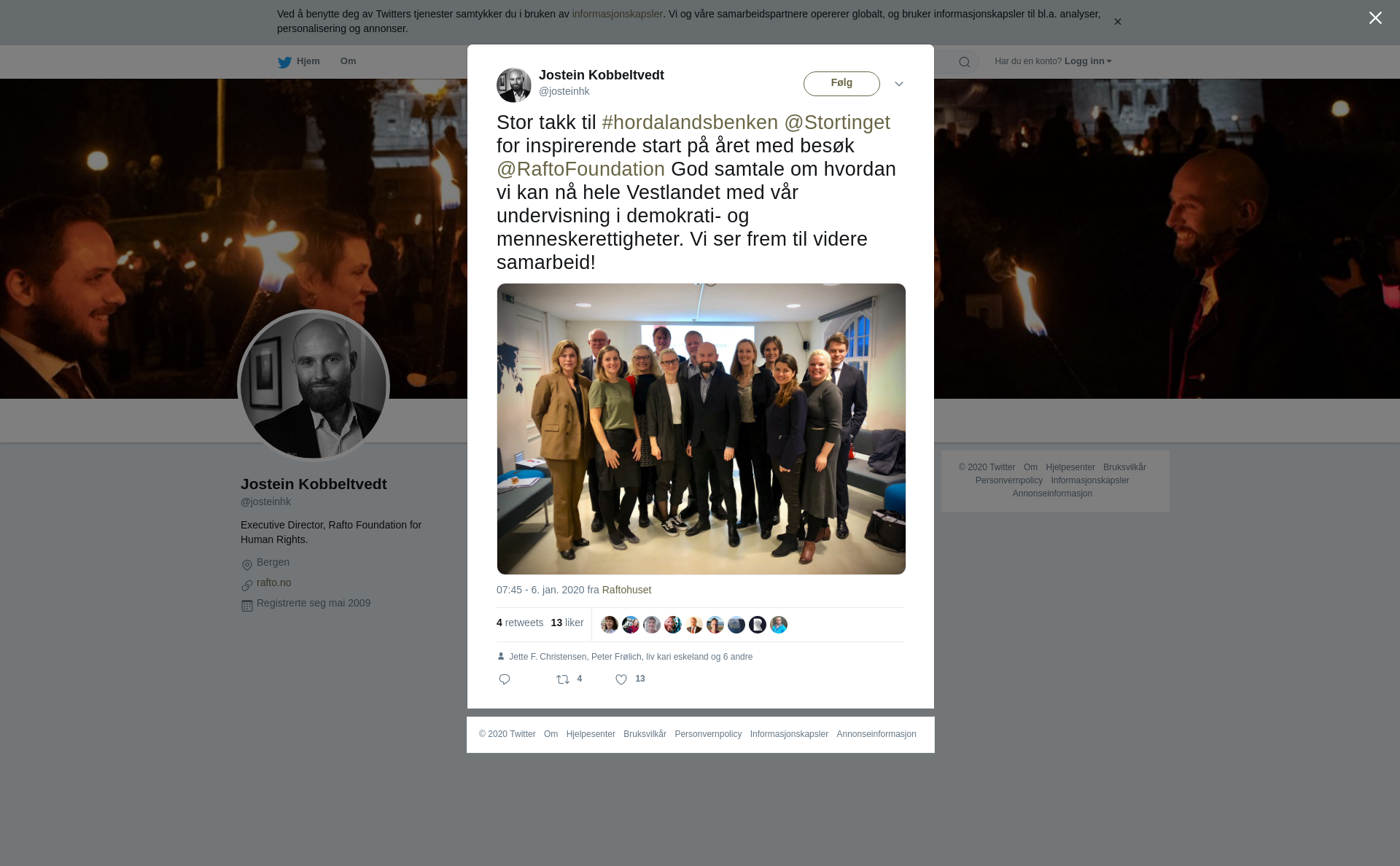 RT @josteinhk: Stor takk til #hordalandsbenken @Stortinget for inspirerende start på året med besøk @RaftoFoundation God samtale om hvordan vi kan nå hele Vestlandet med vår undervisning i demokrati- og menneskerettigheter. Vi ser frem til videre samarbeid! https://t.co/8mTtPRscGr