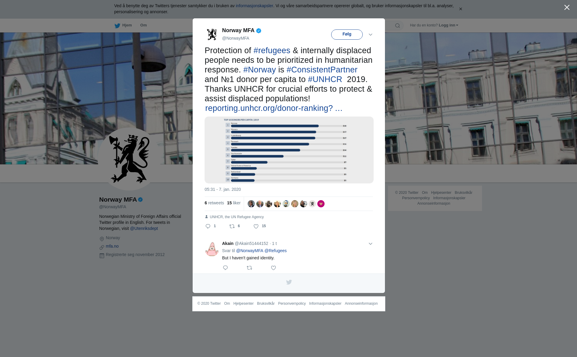 Protection of #refugees & internally displaced people needs to be prioritized in humanitarian response. #Norway is #ConsistentPartner and №1 donor per capita to #UNHCR 2019. Thanks UNHCR for crucial efforts to protect & assist displaced populations! https://t.co/LenlrSqpax https://t.co/kRycTzX82R