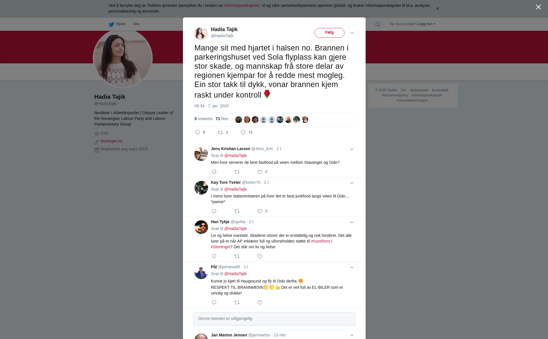 RT @HadiaTajik: Mange sit med hjartet i halsen no. Brannen i parkeringshuset ved Sola flyplass kan gjere stor skade, og mannskap frå store delar av regionen kjempar for å redde mest mogleg. Ein stor takk til dykk, vonar brannen kjem raskt under kontroll🌹