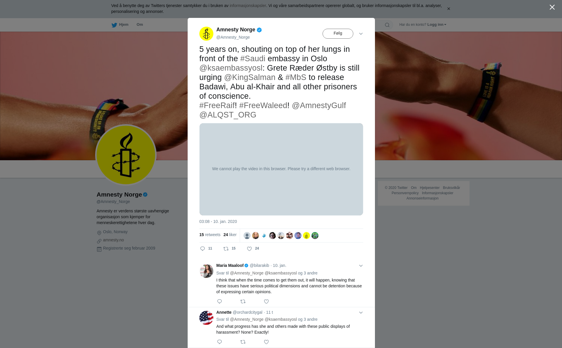 RT @Amnesty_Norge: 5 years on, shouting on top of her lungs in front of the #Saudi embassy in Oslo @ksaembassyosl: Grete Ræder Østby is still urging @KingSalman & #MbS to release Badawi, Abu al-Khair and all other prisoners of conscience.
